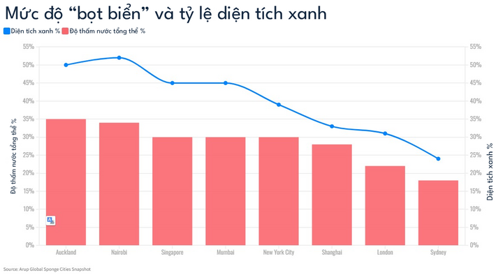 Biểu đồ so sánh độ "thấm nước" và tỷ lệ diện tích xanh mặt nước của 8 thành phố lớn. (Nguồn: Arup)