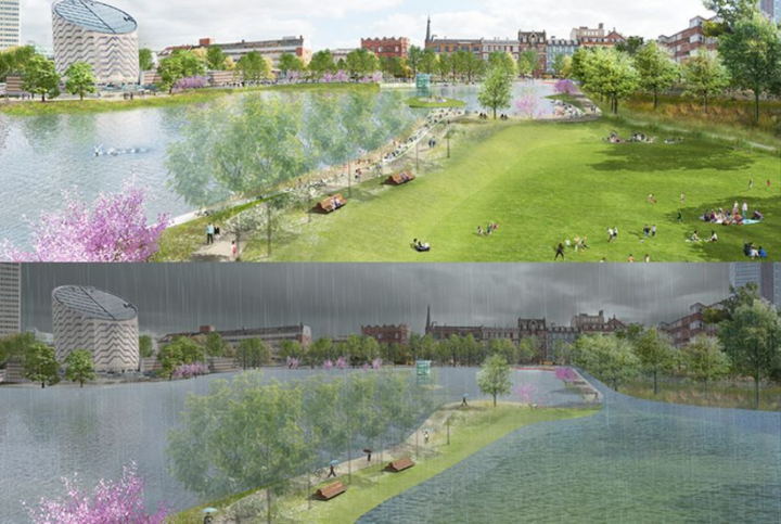Thay vì tiếp tục mở rộng hệ thống cống ngầm truyền thống, Copenhagen đã chọn cách tái thiết không gian công cộng để hấp thụ và lưu trữ nước mưa. Một ví dụ điển hình là Công viên Enghaveparken, nơi được cải tạo để chứa lượng nước tương đương 10 hồ bơi Olympic trong các bể ngầm dưới lòng đất. Những cải tiến này không chỉ giúp giảm nguy cơ ngập lụt mà còn tạo ra các tiện ích đô thị như hồ cảnh quan, khu vui chơi và nguồn nước tưới cây.