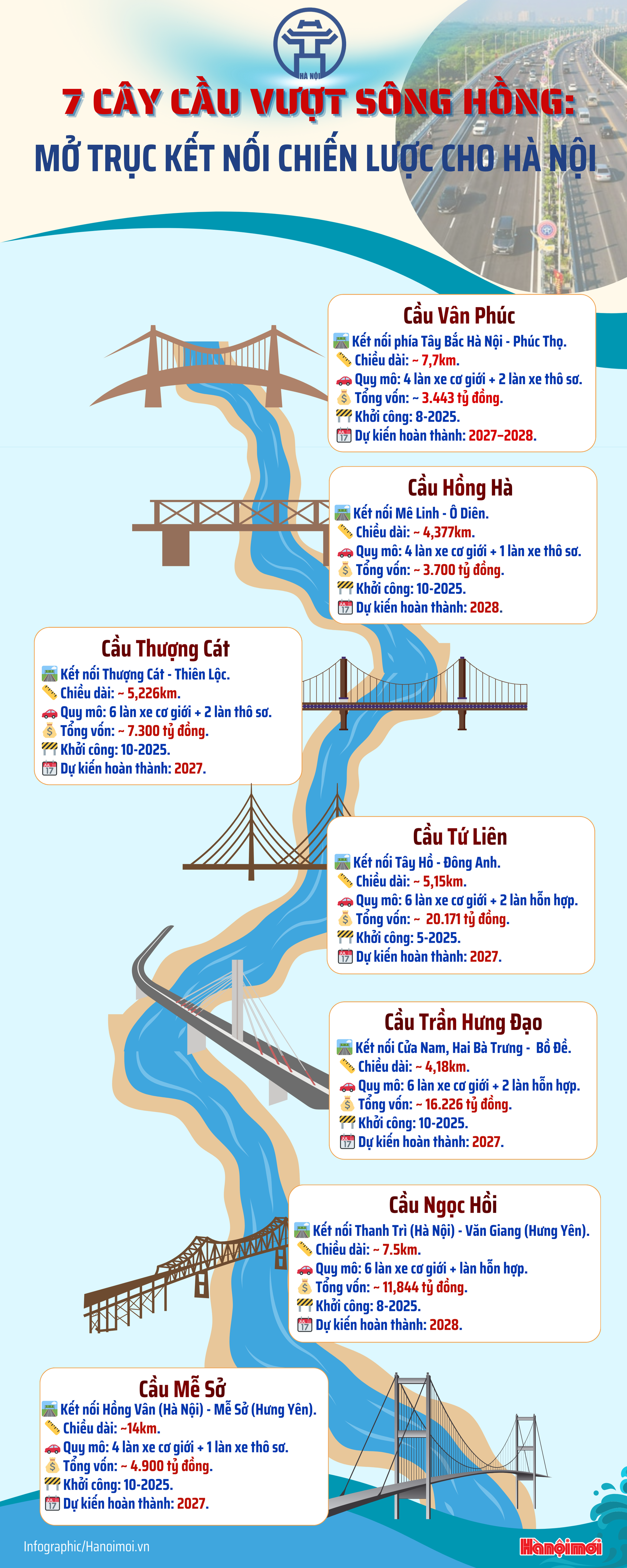 Trong năm 2025 vừa qua, Thành phố đã liên tục khởi công 7 cây cầu vượt sông Hồng, gồm: Hồng Hà, Mễ Sở (trên tuyến Vành đai 4); Tứ Liên, Thượng Cát, Ngọc Hồi (trên tuyến Vành đai 3,5); Trần Hưng Đạo, Vân Phúc (trên tuyến đường trục Bắc - Nam nối với tỉnh Vĩnh Phúc, nay là tỉnh Phú Thọ).