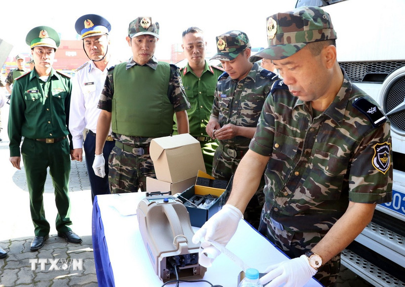 Diễn tập, sử dụng máy soi container, chó nghiệp vụ, máy phát hiện ma túy cầm tay và một số trang thiết bị chuyên dùng của lực lượng hải quan phát hiện, bắt giữ lô hàng container có cất giấu ma túy. (Ảnh: Mạnh Tú/TTXVN)