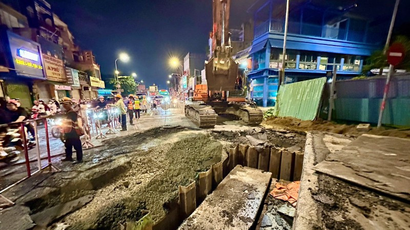Ban Quản lý Đường sắt đô thị Thành phố Hồ Chí Minh tổ chức thi công di dời hạ tầng kỹ thuật vào ban đêm, qua đó đẩy nhanh tiến độ khởi công tuyến Metro số 2. (Ảnh: QUÝ HIỀN)