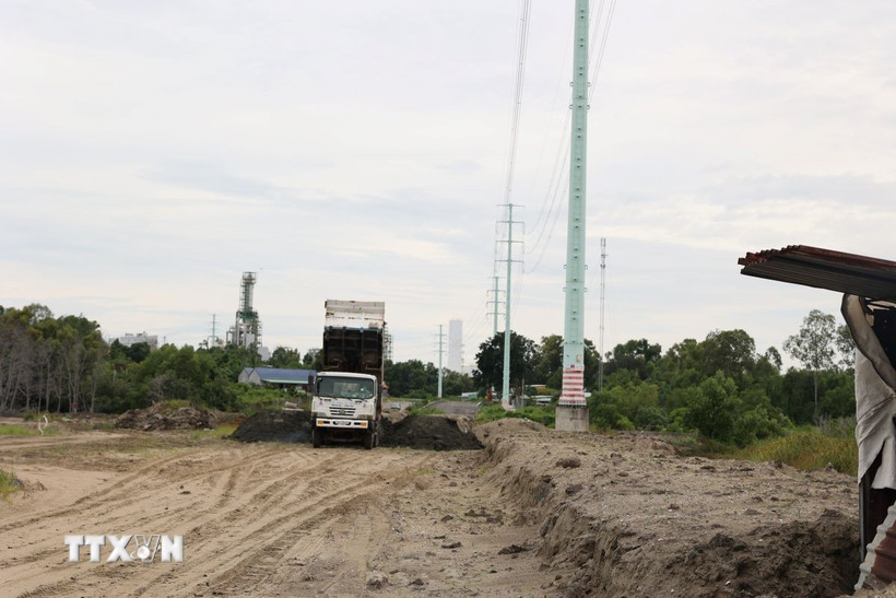 Đơn vị thi công đắp đất nền đường dự án Long Sơn-Cái Mép. (Ảnh: Hoàng Nhị/TTXVN)