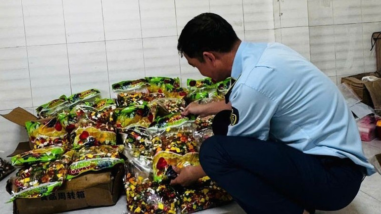 Lực lượng quản lý thị trường kiểm đếm kẹo dẻo không rõ nguồn gốc, xuất xứ.