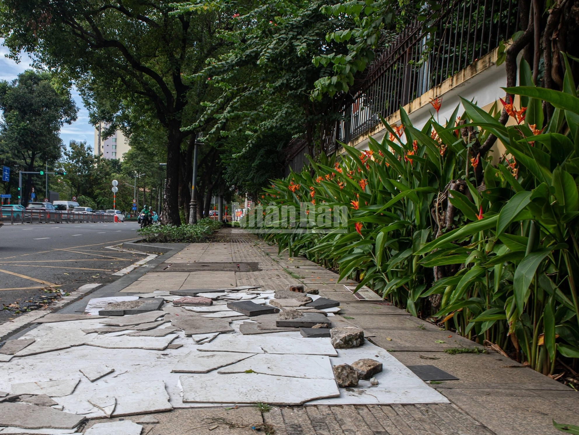 Vỉa hè đi bộ cũng bong tróc khiến đoạn đường dành riêng người đi bộ và vị trí di chuyển cho người khiếm thị trở thành cái bẫy.
