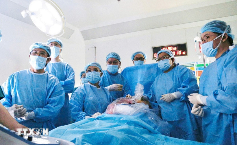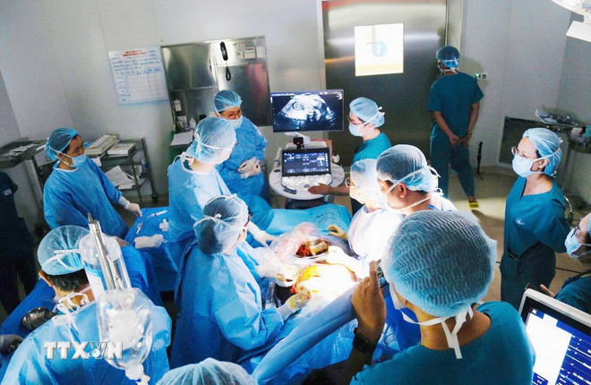 Các bác sỹ Bệnh viện Từ Dũ phối hợp cùng Bệnh viện Nhi đồng 1 Thành phố Hồ Chí Minh thực hiện can thiệp thông tim bào thai. (Ảnh: TTXVN phát)