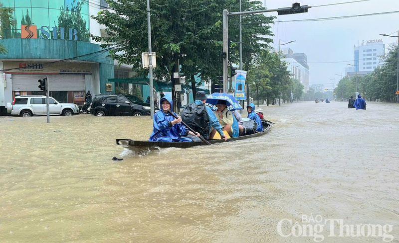 Đường phố Huế biến thành sông, những chiếc thuyền là phương tiện di chuyển chính trong mưa lũ