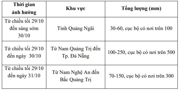 Từ chiều tối 29/10 đến ngày 30/10, ở khu vực từ Nam Quảng Trị đến TP. Đà Nẵng có mưa to đến rất to với lượng mưa phổ biến 100-250mm, cục bộ có nơi trên 500mm (từ đêm 30/10 mưa lớn có khả năng giảm dần).