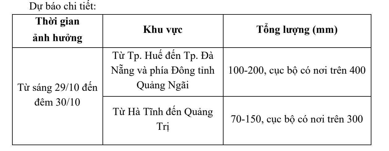Từ chiều tối 29/10 đến ngày 31/10, khu vực từ Nam Nghệ An đến Bắc Quảng Trị có mưa vừa, mưa to với lượng mưa phổ biến 70-150mm, cục bộ có nơi mưa rất to trên 300mm. Cảnh báo nguy cơ mưa có cường độ lớn hơn 150mm/3h.