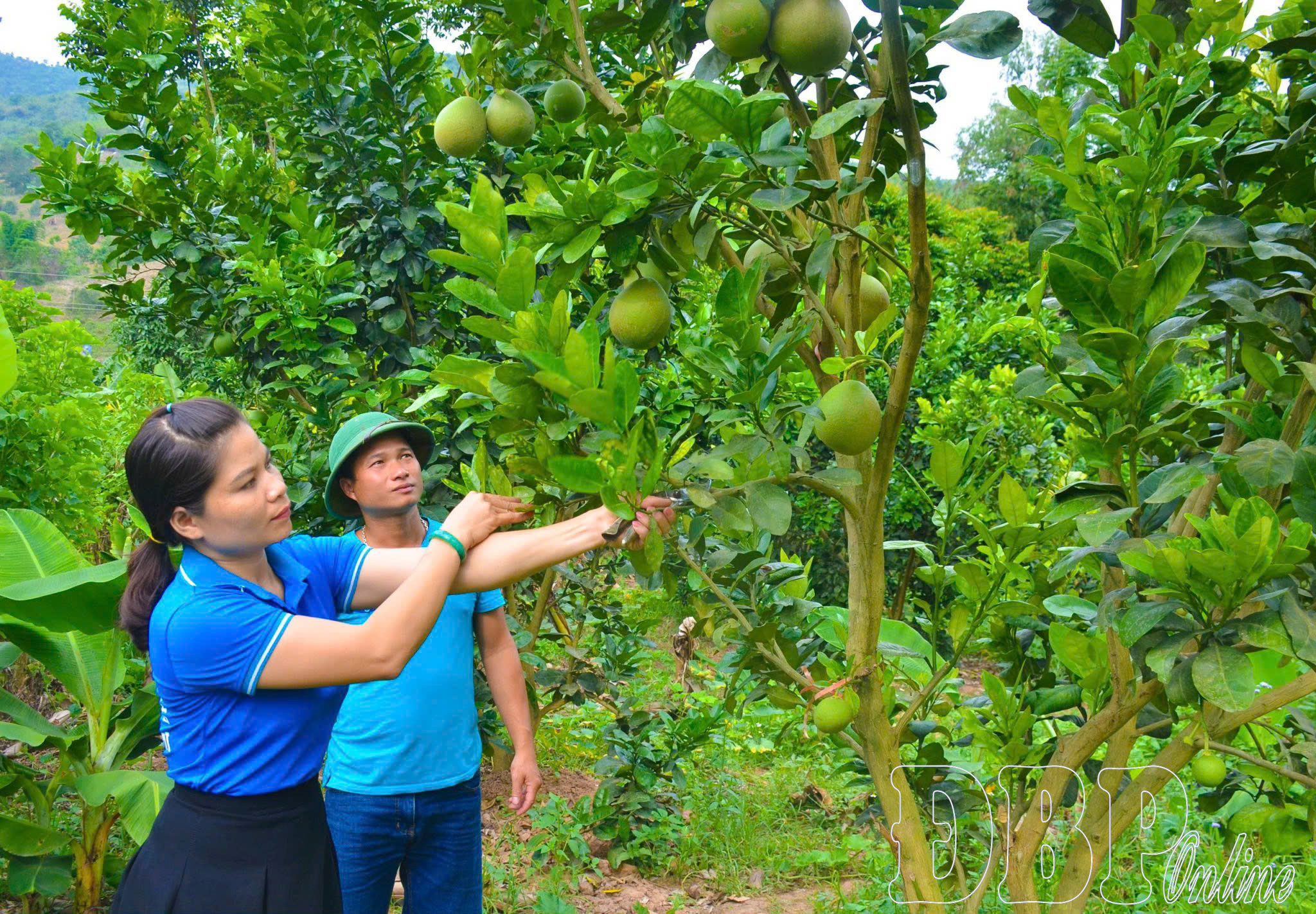 Người dân bản Mường Mươn 1, xã Mường Pồn kiểm tra, chăm sóc mô hình trồng bưởi. Ảnh: Phạm Quang