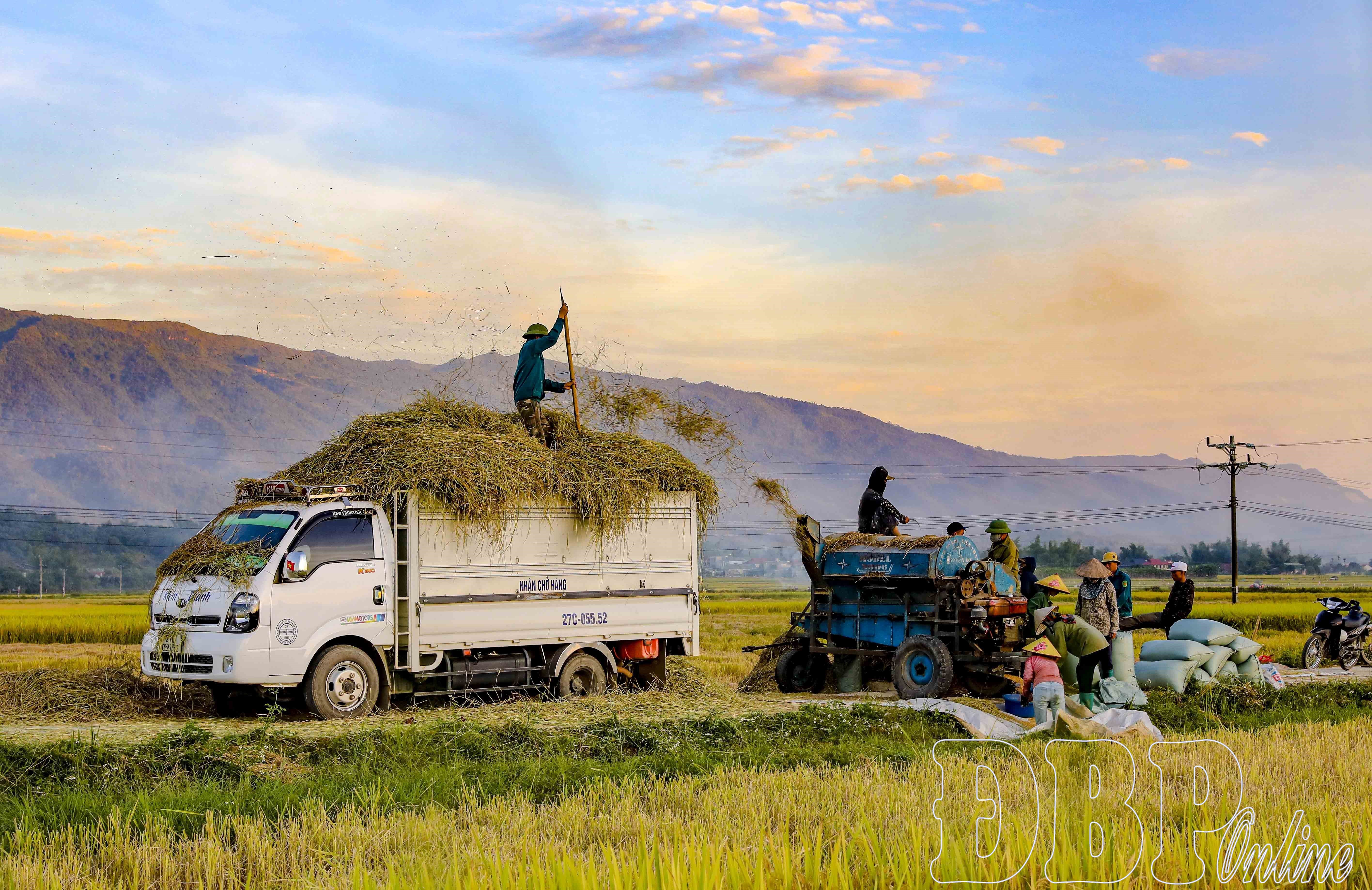 Người dân vùng lòng chảo Mường Thanh thu hoạch lúa. Ảnh: Xuân Tư