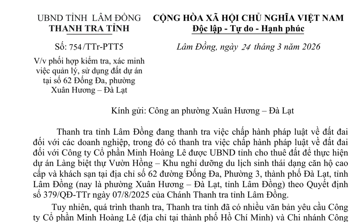 Quá trình thanh tra, Thanh tra tỉnh Lâm Đồng có nhiều văn bản yêu cầu Công ty CP Minh Hoàng Lê có địa chỉ tại TP.HCM và chi nhánh công ty tại số 62 Đống Đa, phường Xuân Hương - Đà Lạt phối hợp cung cấp hồ sơ, tài liệu, làm việc và kiểm tra thực địa tại dự án.