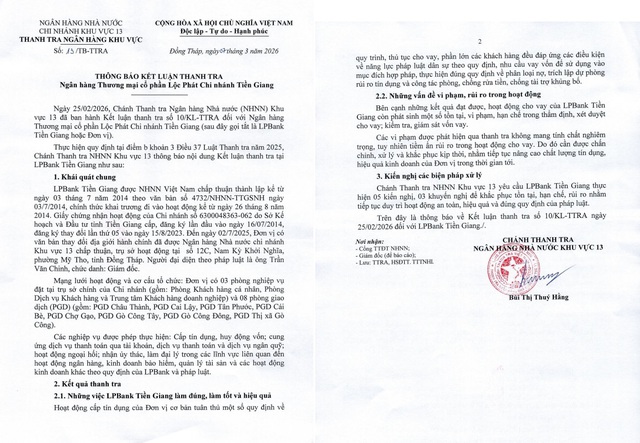 Thanh tra Ngân hàng Nhà nước Khu vực 13 thông báo kết luận thanh tra đối với Ngân hàng Thương mại Cổ phần Lộc Phát chi nhánh Tiền Giang (LPBank Tiền Giang).