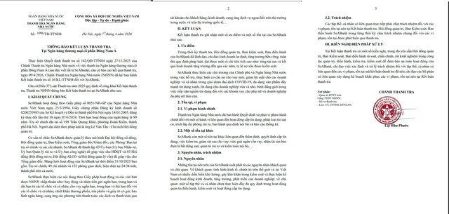 Ngày 17/4, Thanh tra Ngân hàng Nhà nước thông báo kết luận thanh tra tại Ngân hàng Thương mại Cổ phần Đông Nam Á (SeABank). Cơ quan Thanh tra đã chỉ ra những ưu điểm, cũng như tồn tại, hạn chế và xử phạt vi phạm hành chính đối với SeABank, đồng thời yêu cầu ngân hàng khắc phục các tồn tại.