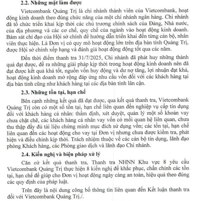 Căn cứ kết quả thanh tra, Thanh tra NHNN Khu vực 8 yêu cầu Vietcombank Quảng Trị thực hiện 8 kiến nghị để khắc phục, chấn chỉnh các tồn tại, hạn chế để giúp cho chi nhánh hoạt động ngày càng an toàn, hiệu quả theo đúng các quy định của pháp luật.