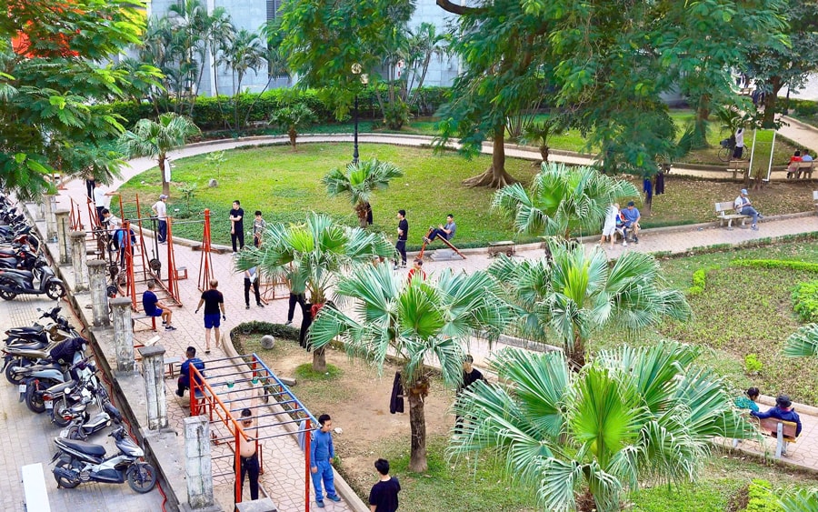 Công viên Indira Gandhi (phường Giảng Võ) bỏ hoàn toàn tường rào hướng tới mô hình “công viên thông minh”, đáp ứng nhu cầu sinh hoạt, vui chơi của người dân. Ảnh: Duy Khánh