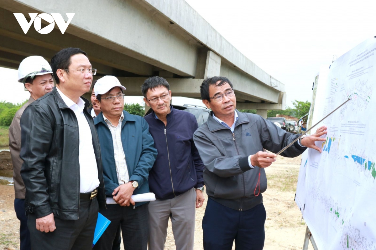 Ông Nguyễn Công Hoàng, Phó Chủ tịch UBND tỉnh Quảng Ngãi (thứ nhất, bìa trái) nghe báo cáo tình hình thực hiện các dự án Đường ven biển Dung Quất - Sa Huỳnh (giai đoạn IIa, thành phần 1).