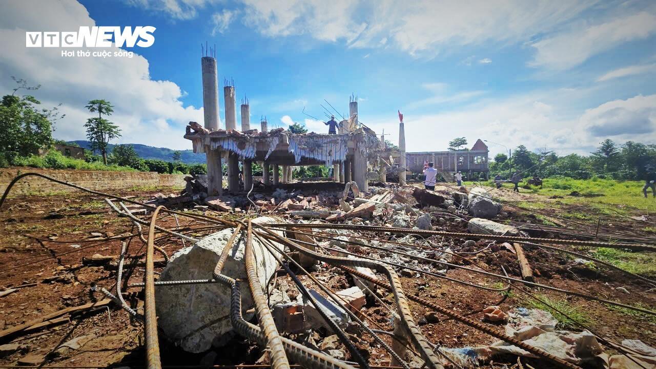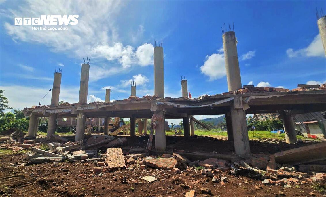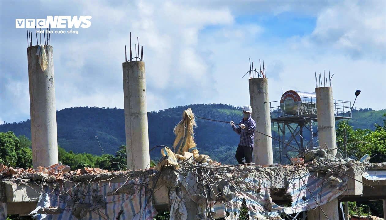 Theo ghi nhận hiện trường, đơn vị thi công đang huy động nhân lực, phương tiện để tiến hành tháo dỡ các hạng mục chính như tường thô, trụ cột bê-tông và phần phụ trợ.