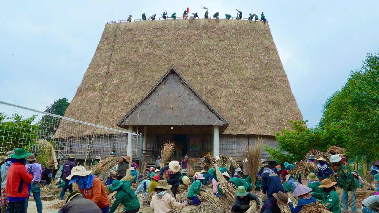 Nhà rông truyền thống của người J'rai làm bằng gỗ, tre, nứa và lợp mái tranh.