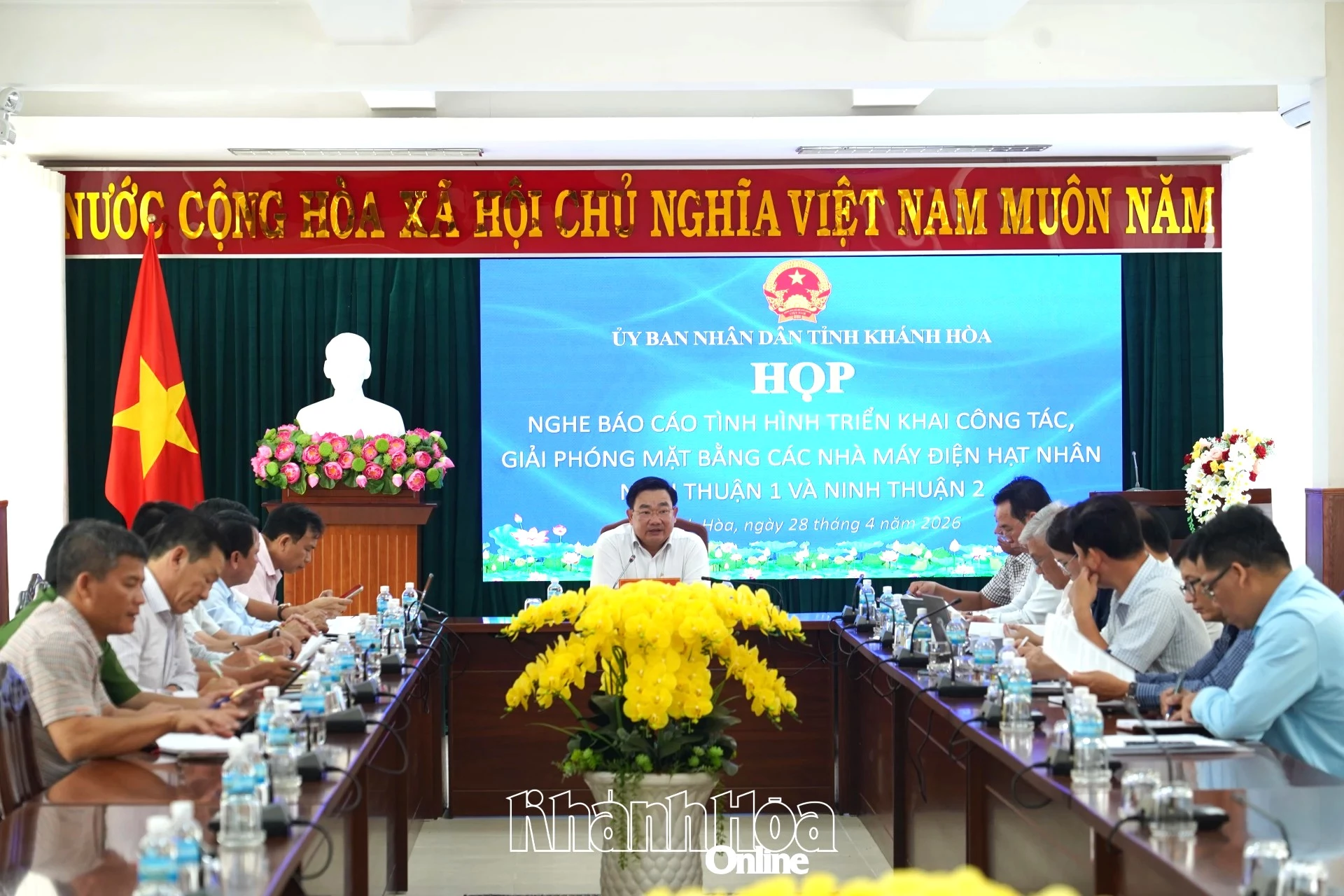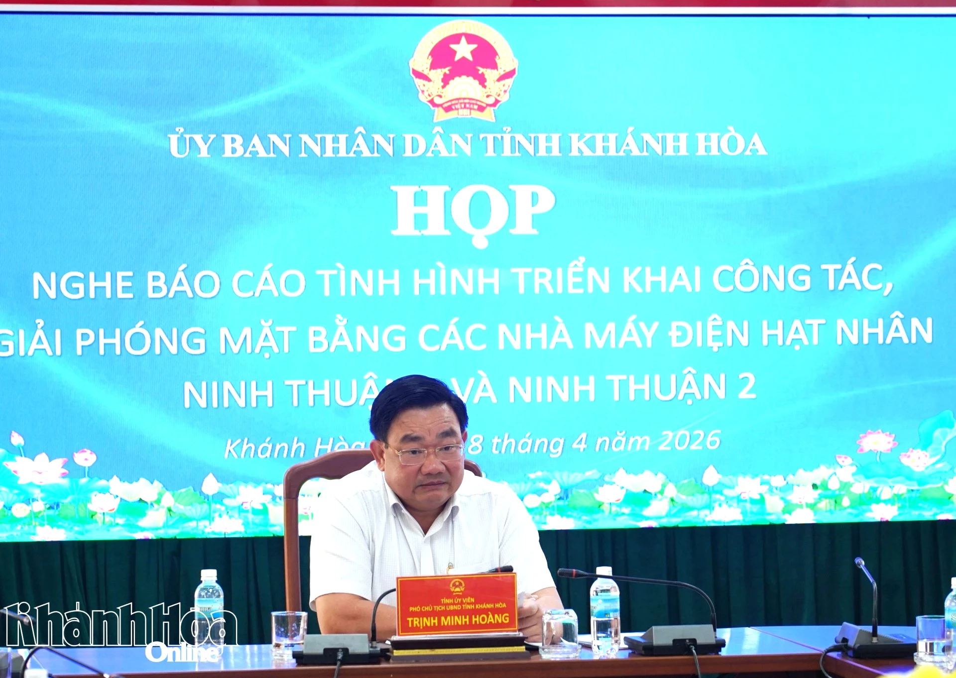 Chiều 28-4, đồng chí Trịnh Minh Hoàng - Phó Chủ tịch UBND tỉnh Khánh Hòa chủ trì cuộc họp nghe báo cáo tình hình triển khai công tác giải phóng mặt bằng các dự án Nhà máy điện hạt nhân Ninh Thuận 1 và Ninh Thuận 2. Tham dự có lãnh đạo các sở, ngành, địa phương liên quan.