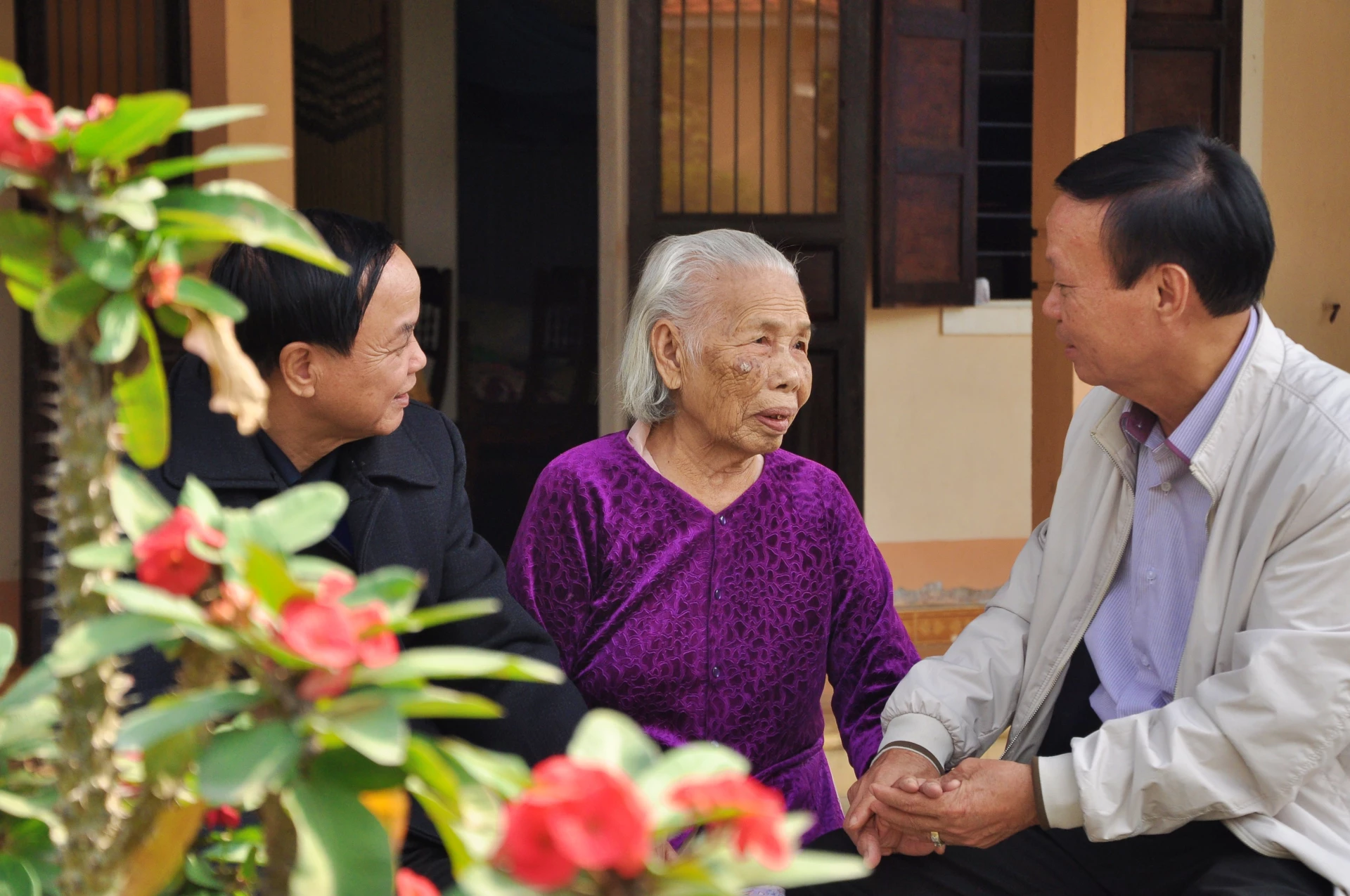 Ông Lê Hữu Thăng (ngoài cùng, phía bên phải) thăm hỏi, động viên Bà mẹ Việt Nam anh hùng Đào Thị Vui - Ảnh: Q.H