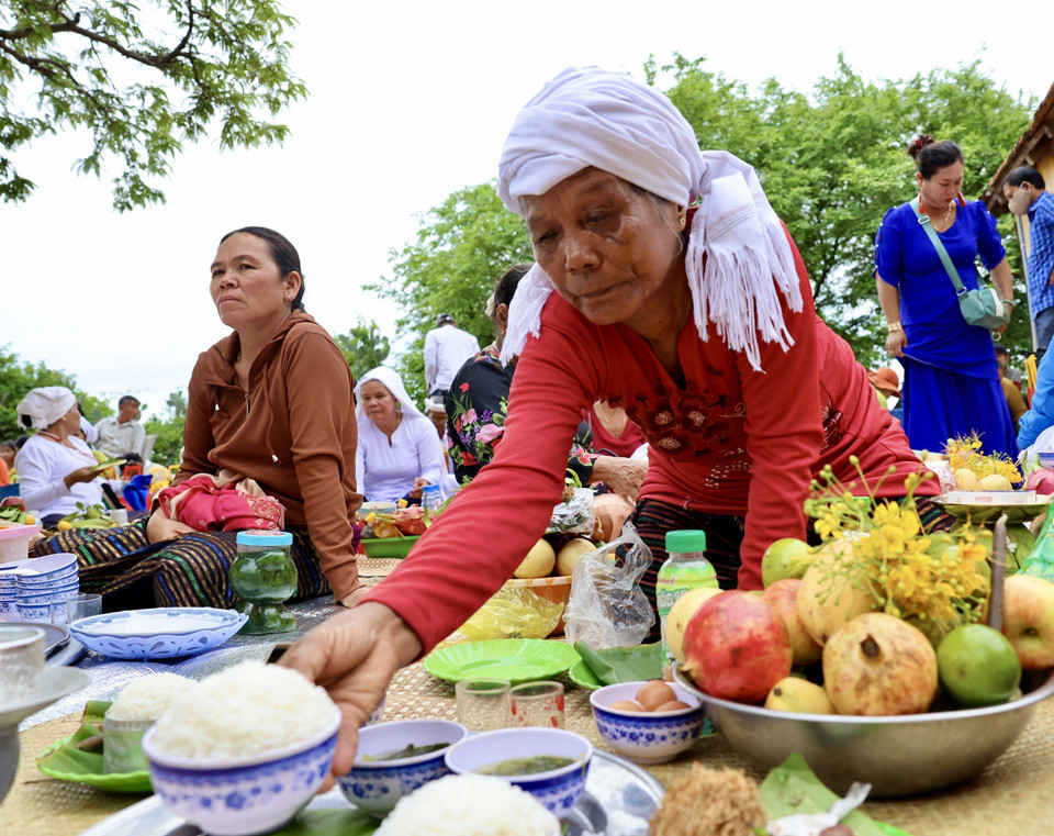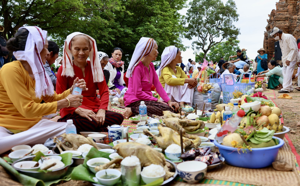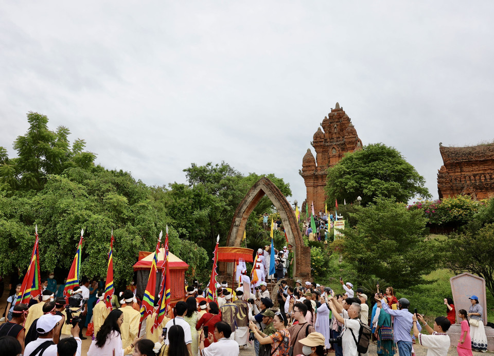 Từng dòng người trong trang phục truyền thống thành kính tiến vào tháp cổ, mang theo lễ vật dâng lên tổ tiên và các vị thần. (Ảnh: Nhật Anh/TTXVN)
