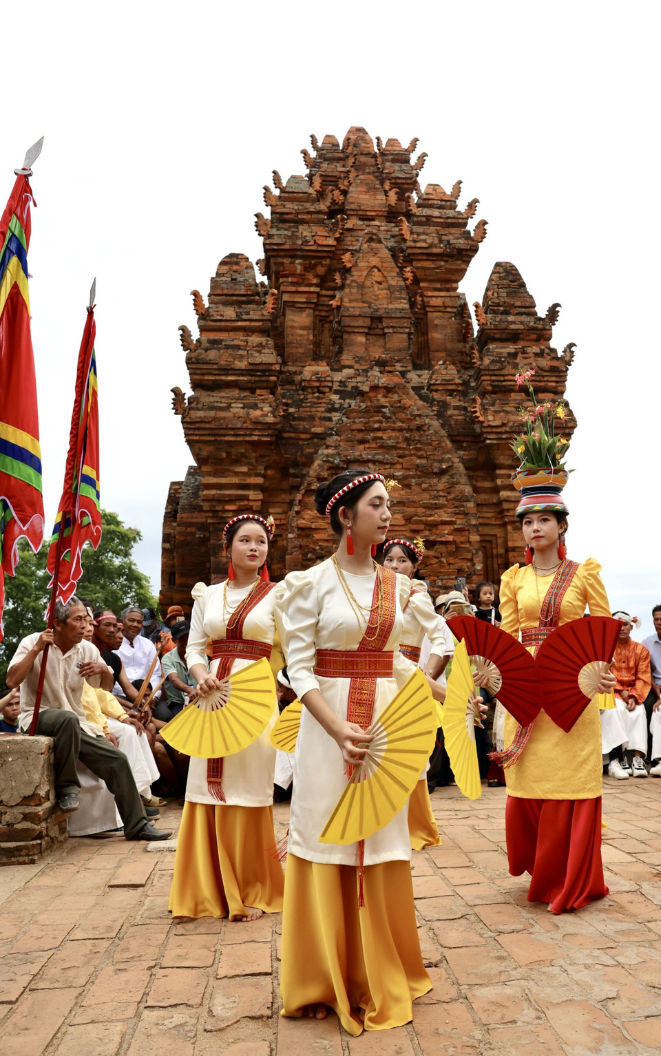 Điệu múa quạt của các thiếu nữ Chăm như những cánh bướm rực rỡ chào đón đoàn rước y trang, biểu tượng của sự sống và niềm vui. (Ảnh: Nhật Anh/TTXVN)