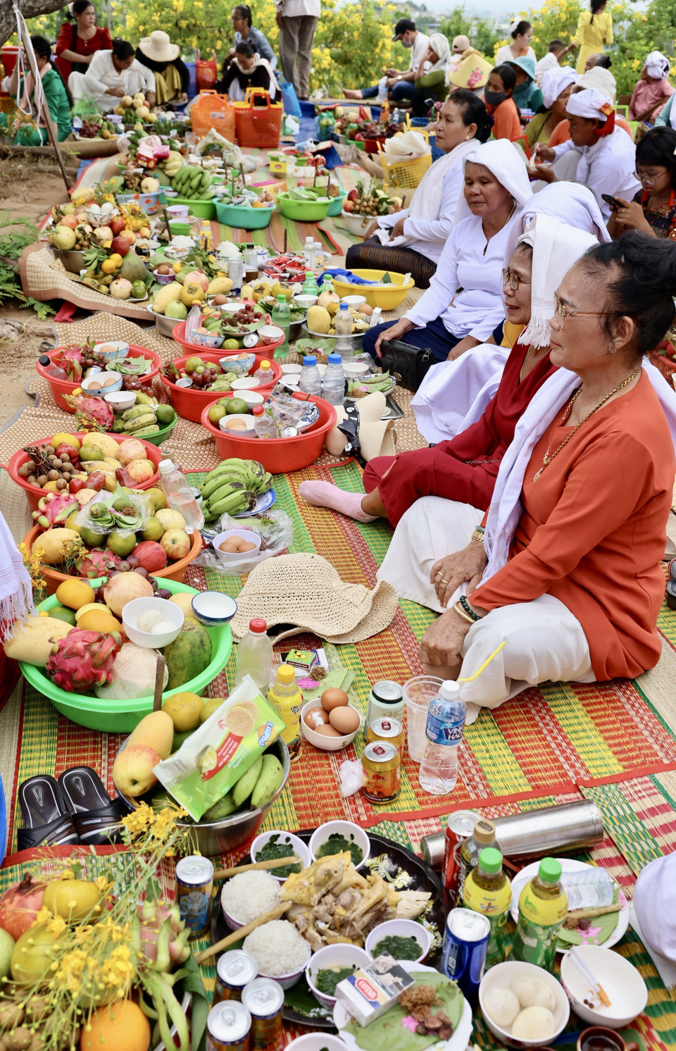 Người Chăm mang lễ vật lên tháp trong lễ hội Katê để dâng cúng thần linh và tổ tiên, cầu mong mưa thuận gió hòa, mùa màng bội thu và bình an cho gia đình. (Ảnh: Nhật Anh/TTXVN)