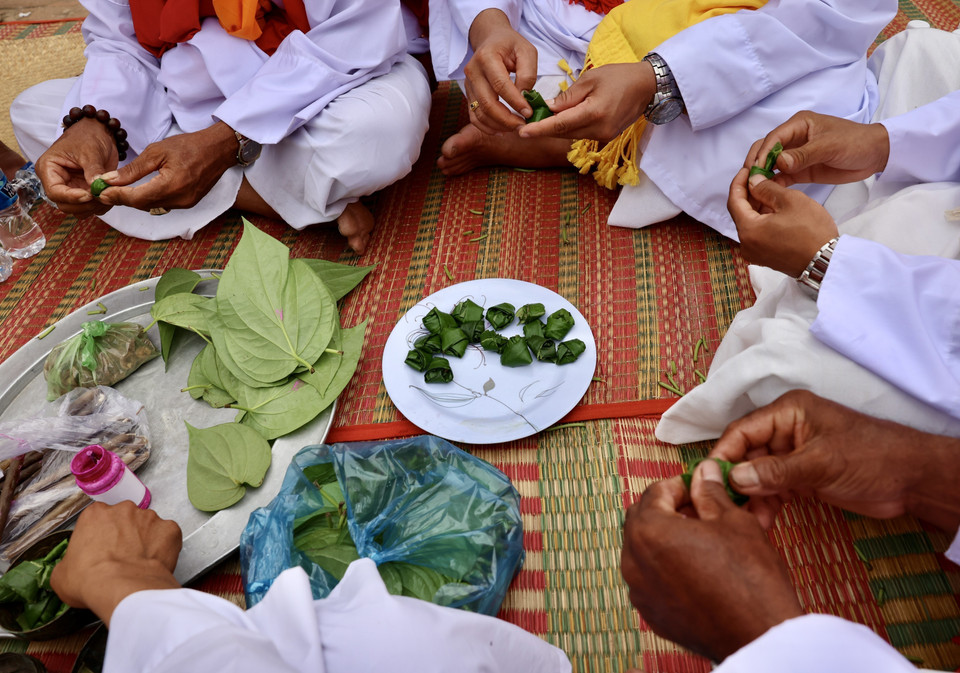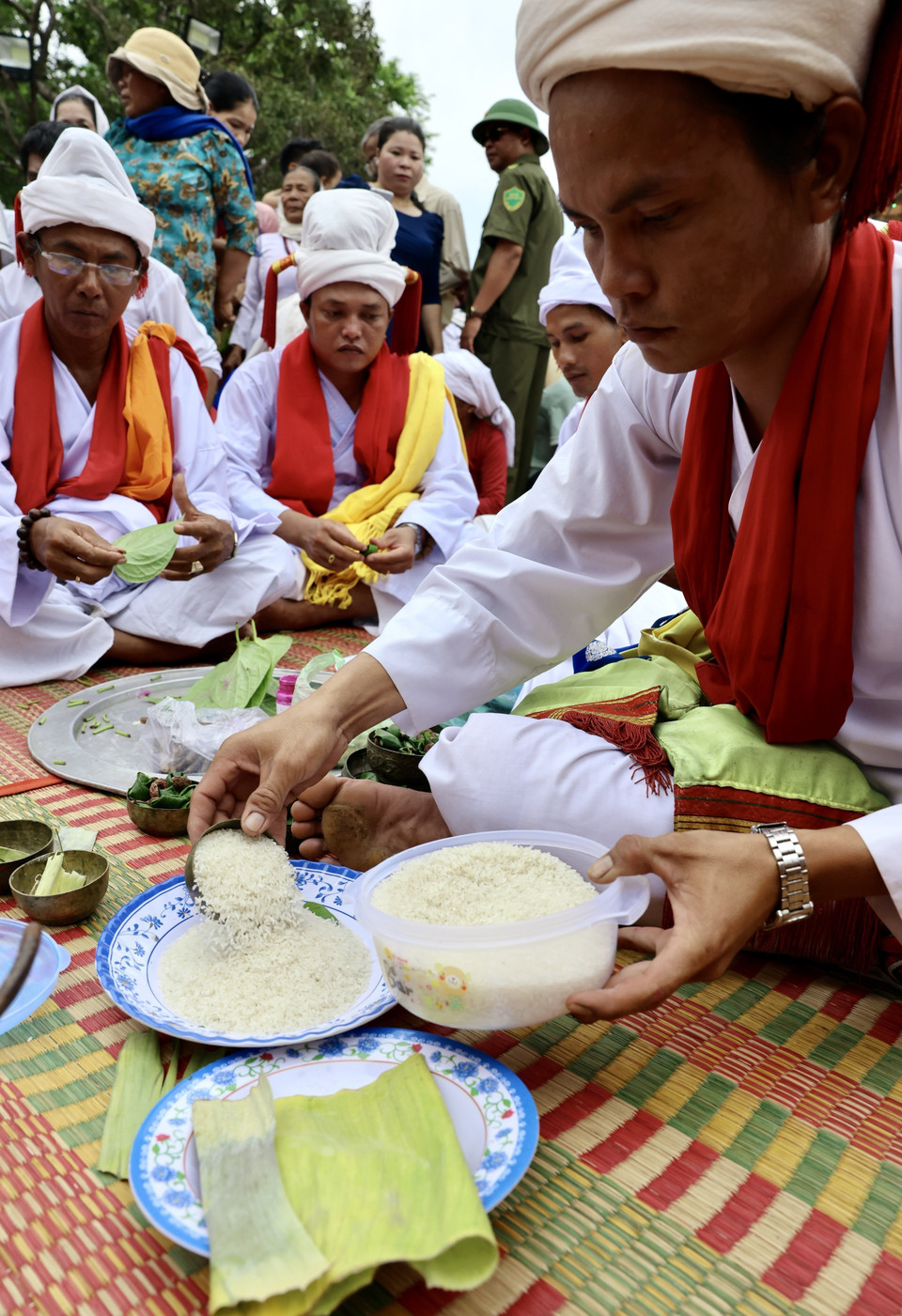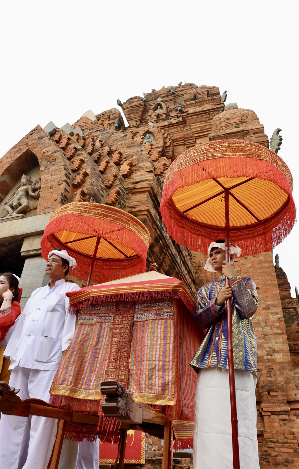 Chức sắc Chăm thực hiện nghi lễ quan trọng, mở ra cánh cổng giao cảm giữa con người và thần linh trong ngày hội Katê. (Ảnh: Nhật Anh/TTXVN)