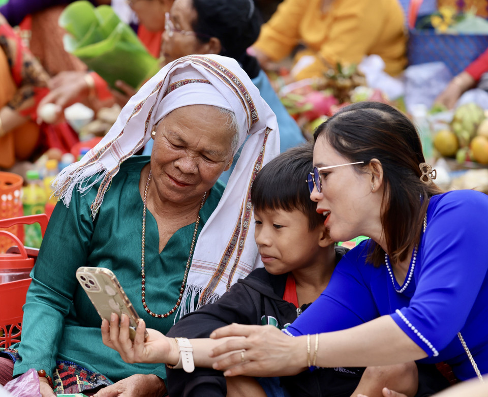 Các thế hệ chia sẻ kỷ niệm về ngày lễ lớn nhất trong năm của người Chăm. (Ảnh: Nhật Anh/TTXVN)