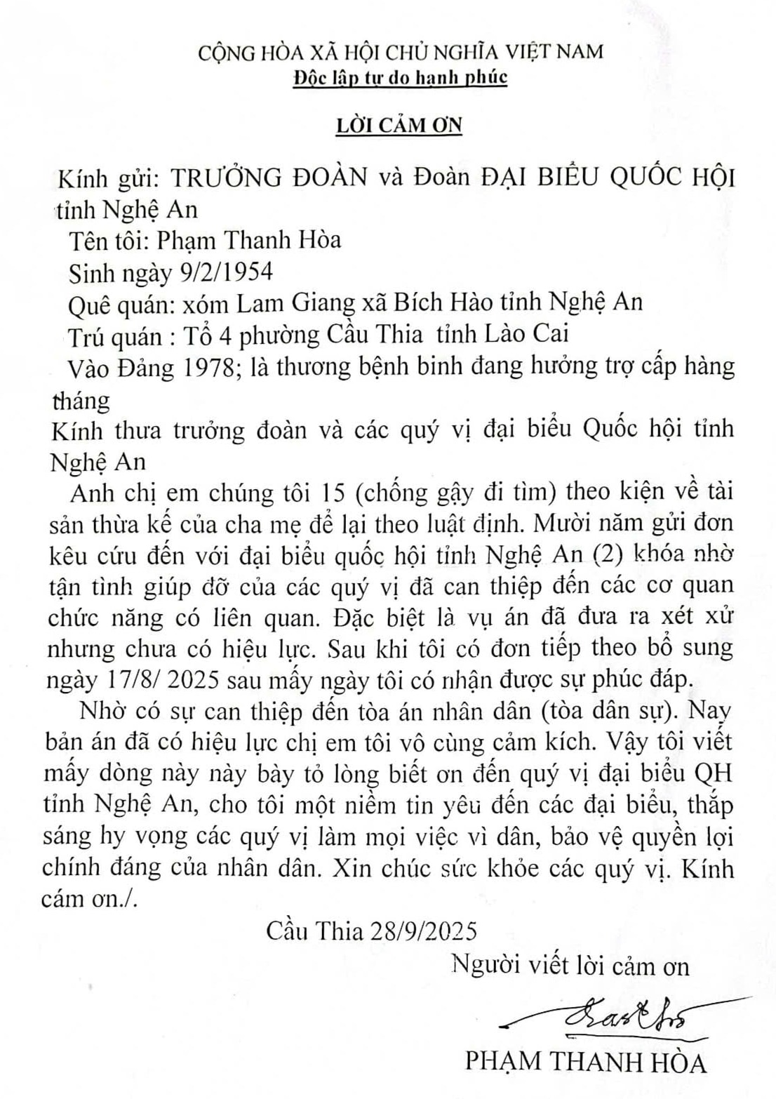 Lá thư cảm ơn của ông Phạm Thanh Hòa - một thương bệnh binh, quê quán gốc tại xóm Lam Giang, xã Bích Hào, tỉnh Nghệ An