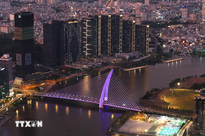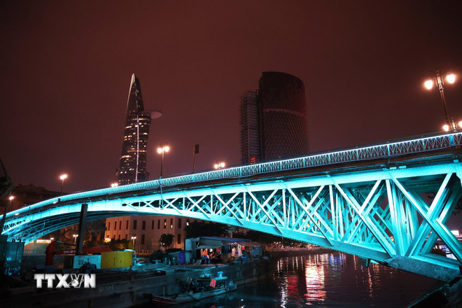 Cầu Ba Son nối trung tâm thành phố với khu đô thị Thủ Thiêm đã triển khai hệ thống chiếu sáng mỹ thuật giai đoạn một từ cuối năm 2024. Thời gian tới, Thành phố tiếp tục lắp đặt thêm đèn LED để tạo hiệu ứng hình động theo từng chủ đề. (Ảnh: Hồng Đạt/TTXVN)