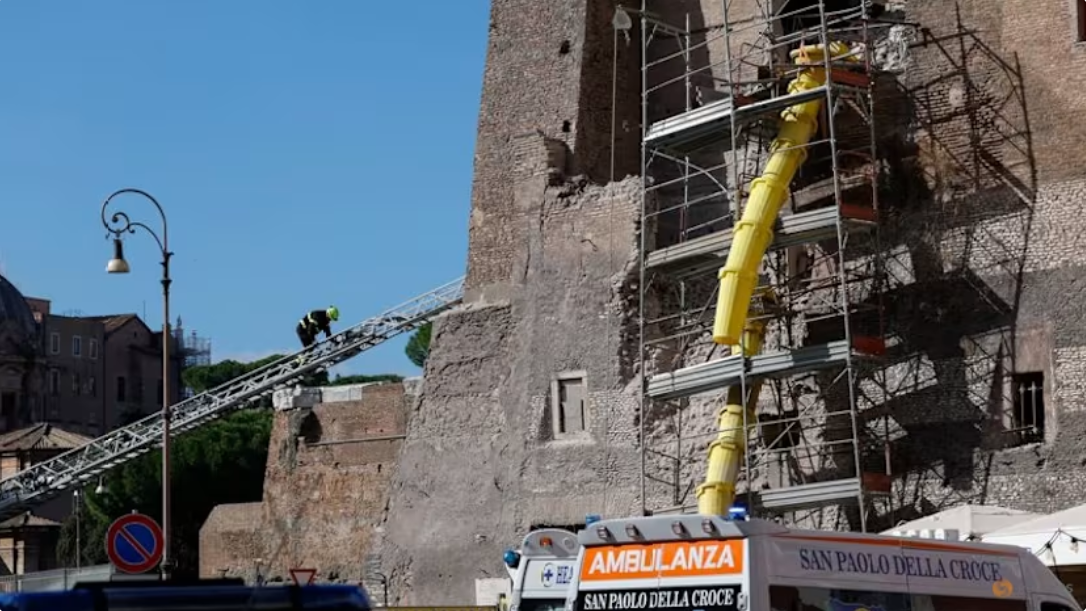 Lực lượng cứu hộ khẩn trương làm việc tại hiện trường vụ sập một phần tháp Torre dei Conti. Ảnh: Reuters