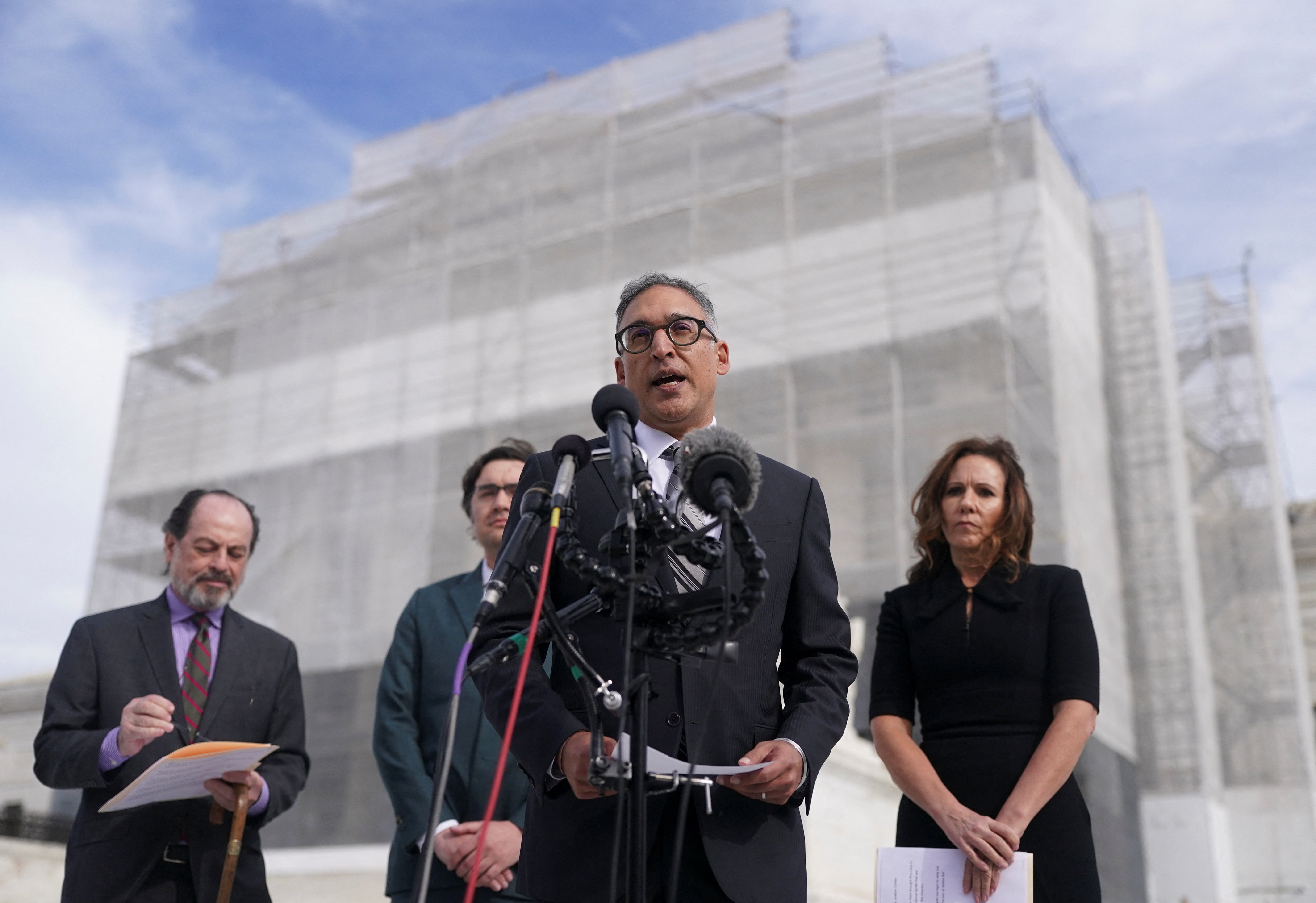 Luật sư Neal Katyal phát biểu trước báo giới bên ngoài Tòa án Tối cao Mỹ khi các thẩm phán chuẩn bị nghe tranh luận miệng về chính sách thuế quan của ông Trump sau khi tòa cấp dưới phán rằng ông đã vượt quá thẩm quyền, tại Washington D.C., ngày 5/11. Ảnh: Reuters.