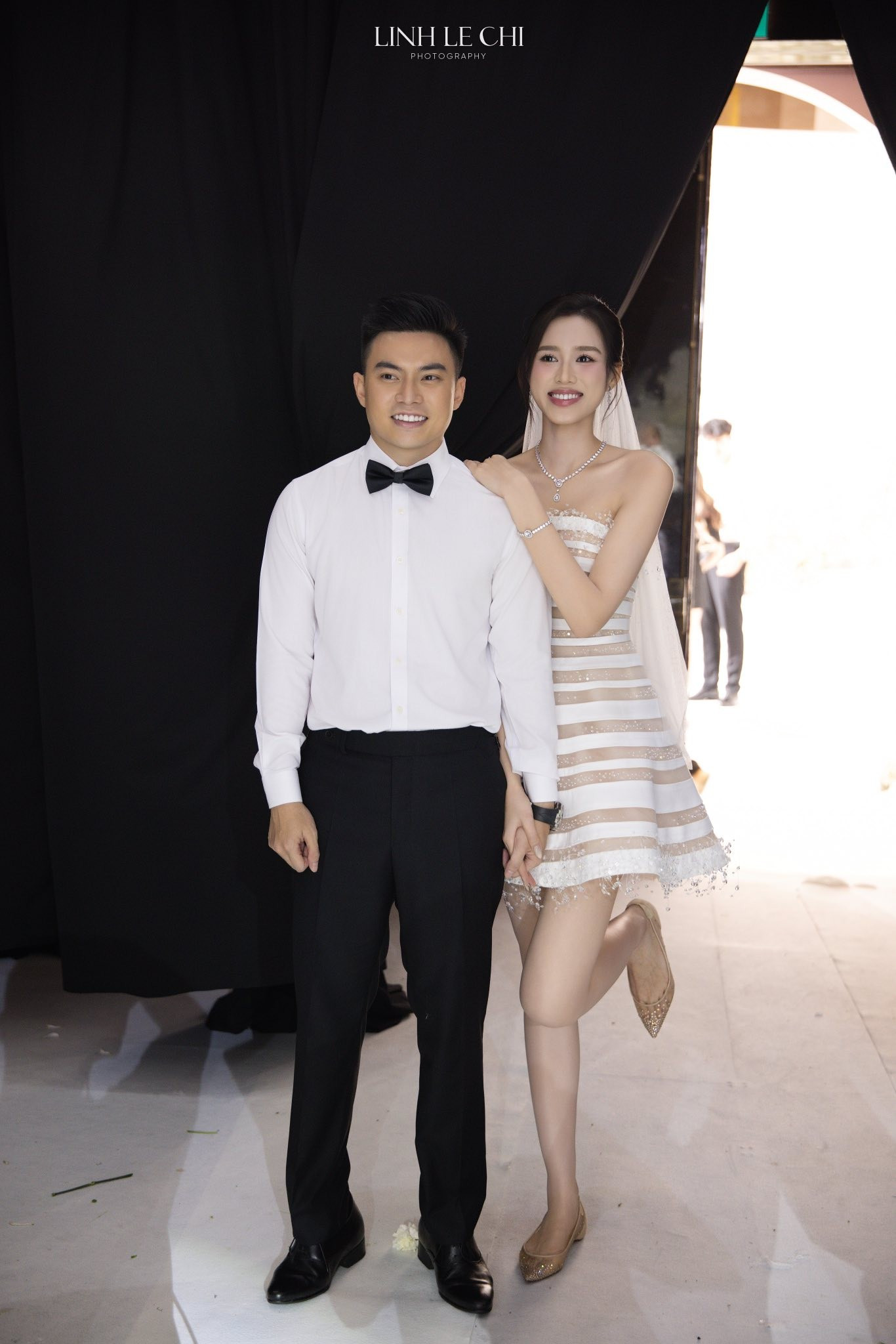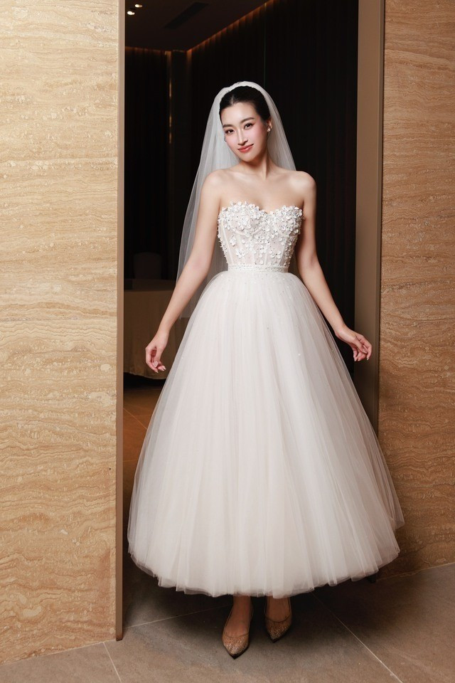Đến tiệc cưới tổ chức ở Hà Nội, Hoa hậu Đỗ Thị Hà thay đổi tới 4 bộ váy cưới với kiểu dáng đa dạng, từ váy ngắn đến váy đuôi cá, rồi váy công chúa bồng bềnh. Nhưng nàng hậu chỉ “chung thủy” với một đôi giày bệt lấp lánh rất bắt mắt.