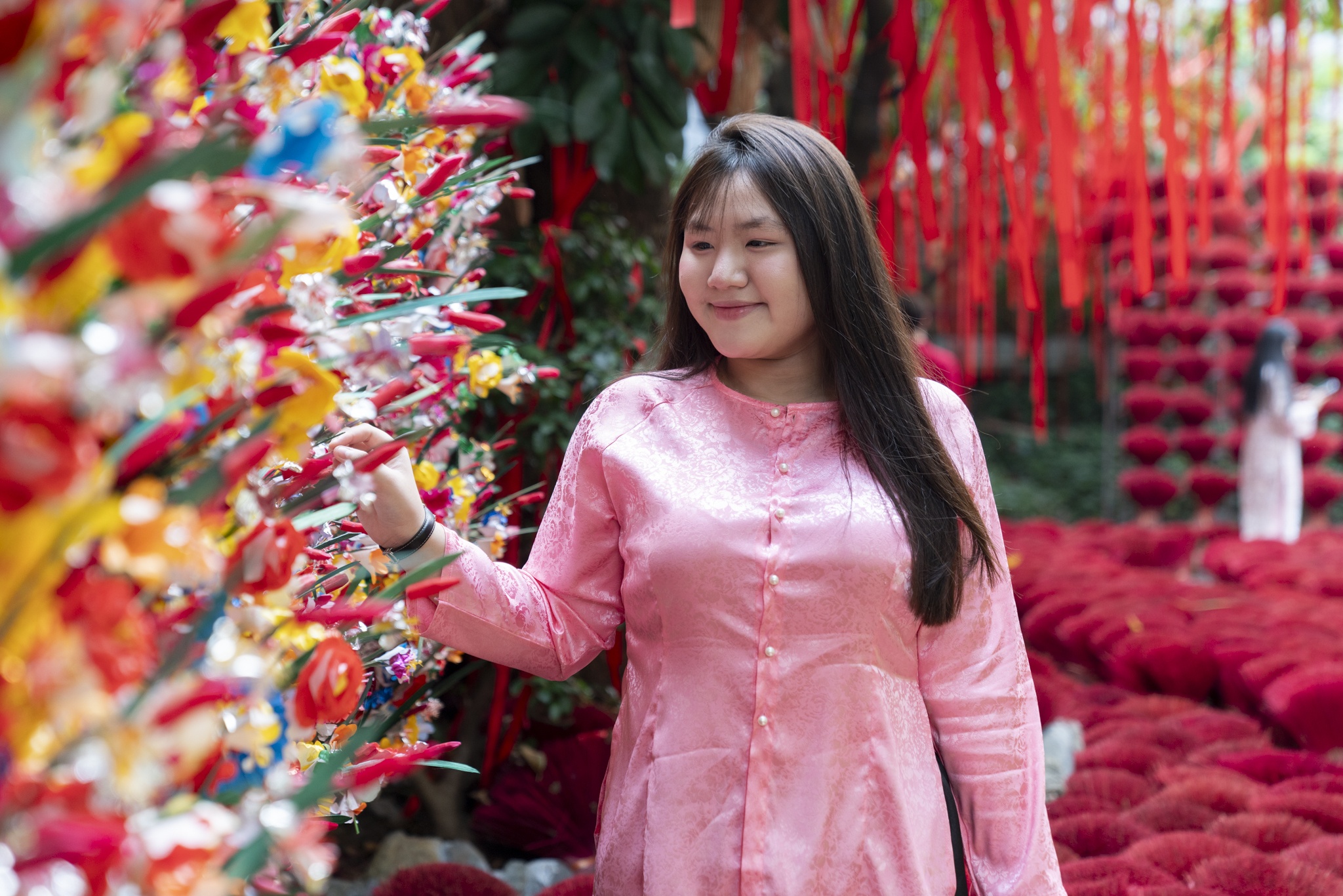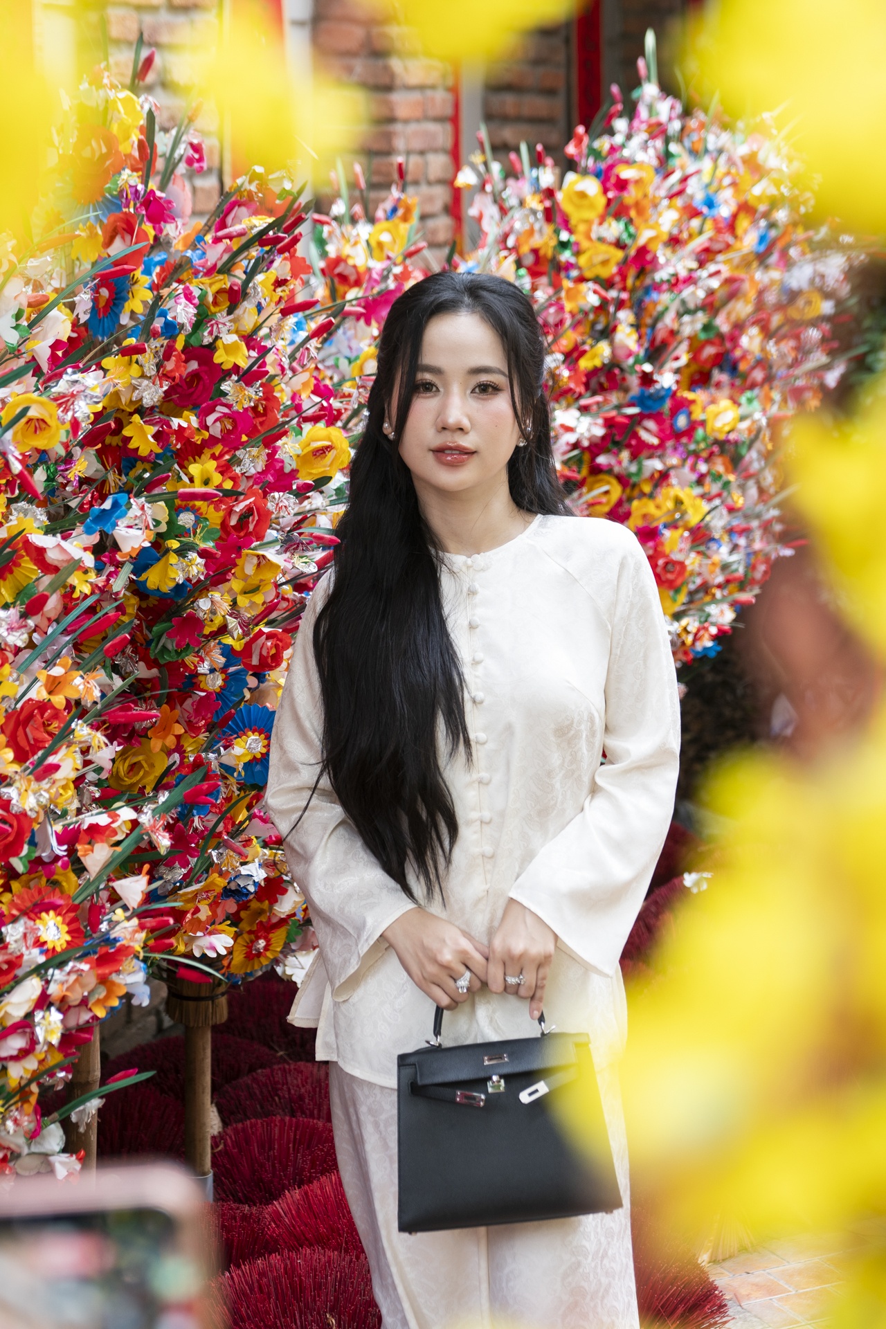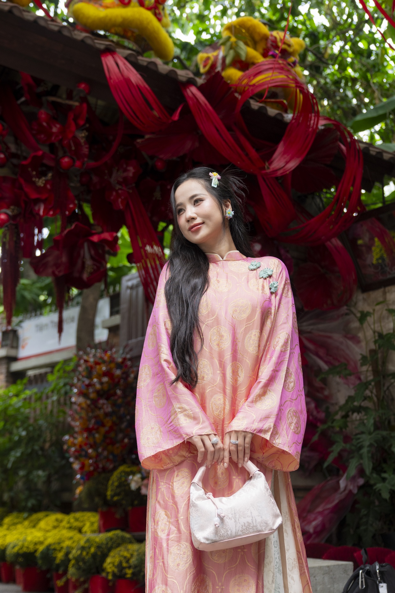 Dịp Tết, áo dài vẫn là lựa chọn chủ đạo của giới trẻ khi chụp ảnh. Bên cạnh đó, nhiều bạn trẻ làm mới hình ảnh bằng áo bà ba hay áo yếm gấm hoa phối cùng quần đơn sắc để tạo điểm nhấn khác lạ. Thanh Thảo (áo hồng, phường Phú Thọ Hòa) cho biết cô biết đến quán qua TikTok. Những năm trước, Thảo thường chụp ảnh Tết ở các chùa, tu viện như Khánh An hay Vĩnh Nghiêm, nhưng năm nay đổi sang quán cà phê vì trang trí sớm và nhiều concept mới hơn. Cô chọn bộ bà ba mua trên sàn thương mại điện tử với giá chỉ hơn 100.000 đồng.