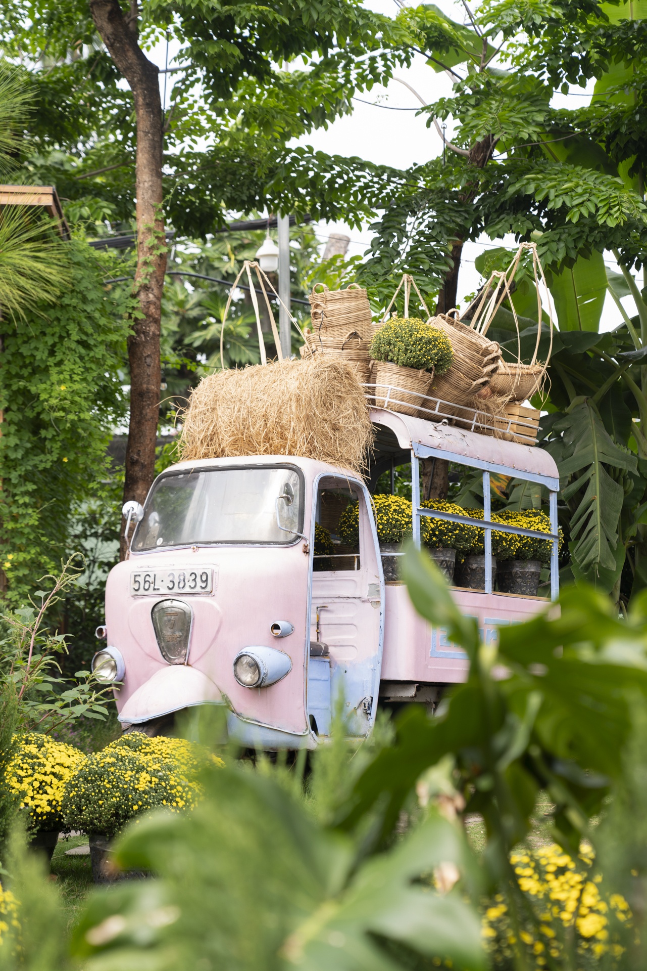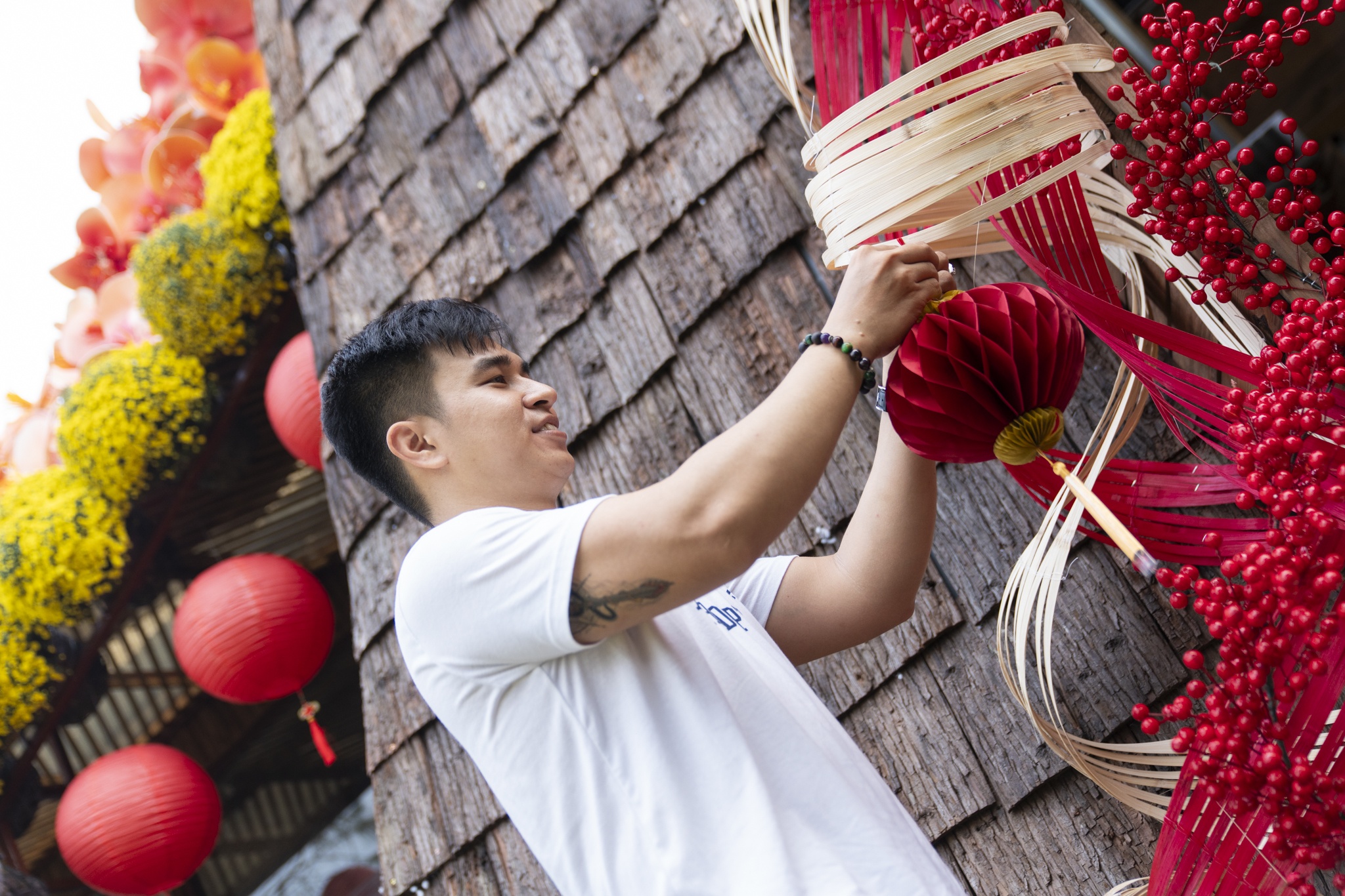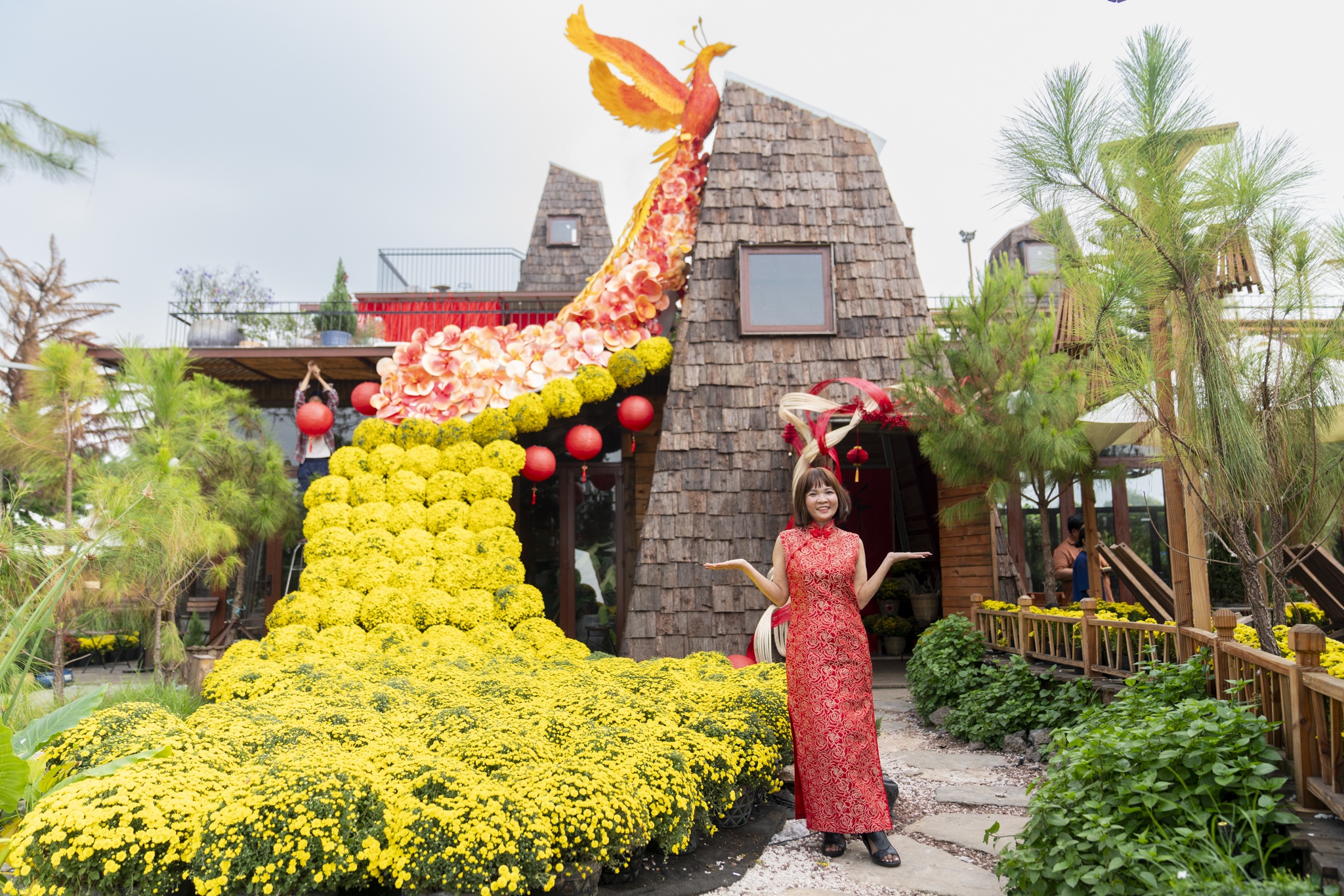 Không muốn quán rập khuôn theo các concept quen thuộc, Trần Thanh Tân - chủ tổ hợp Thông Sài Gòn - chọn hình ảnh phượng hoàng tái sinh từ tro tàn làm chủ đề trang trí Tết. Riêng mô hình Phượng Hoàng là "bài toán khó" từng khiến nhiều đơn vị ngoài Hà Nội nghi ngờ khả năng thi công. Sau khi nhận phần thô, đội ngũ thợ mộc, thợ sắt, thợ hồ của quán phải mất thêm ba ngày để hoàn thiện thân và ráp đuôi. Bên cạnh đó, vườn hoa đào cũng là điểm nhấn dịp này. Đơn vị tháo toàn bộ hoa khỏi cành, gắn lại từng chùm lên thân cây thật được chuyển từ Đà Lạt về. "Nhờ vậy, cây trông tự nhiên như mọc từ đất, không lộ khung sắt", anh chia sẻ.