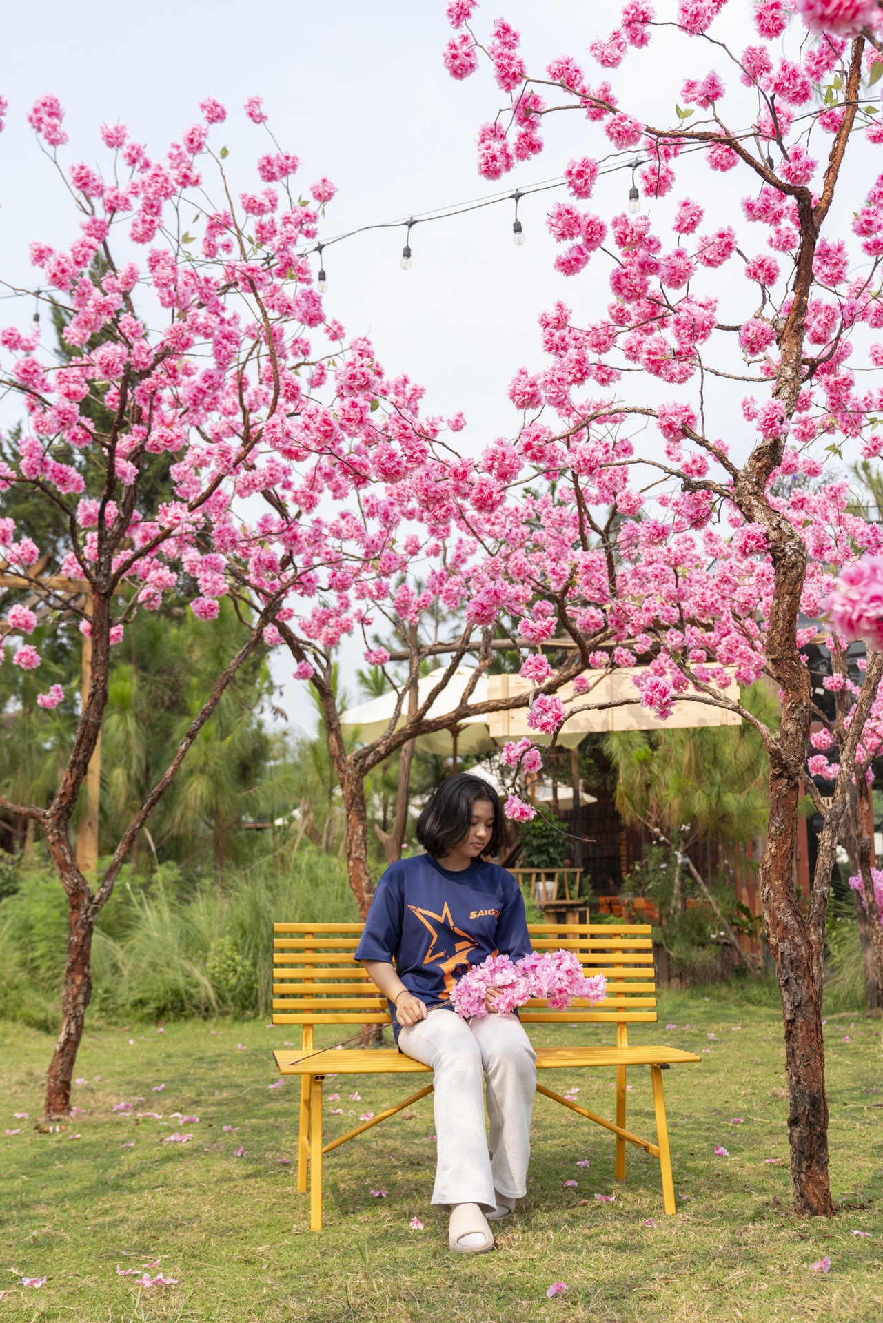 Trong khi đó, một quán cà phê mới mở ở phường An Hội Đông đang hút khách nhờ concept Phượng Hoàng Lâm Uyển kết từ hơn 160 giỏ cúc mâm xôi. Nguyễn Thị Nhung (phường Tân Thới Hiệp) cho biết đây là lần thứ 2 chị quay lại quán, sau lần ghé vào mùa Giáng sinh. "Quán trang trí nổi bật hơn nhiều điểm check-in khác, góc nào lên hình cũng đẹp, vừa quay phim vừa ngồi tán gẫu với bạn bè đều hợp", chị nói. Theo Nhung, mức giá ở đây dễ chịu, đồ uống và món ăn ổn, đặc biệt là bánh canh cá lóc rất hợp khẩu vị. Để buổi chụp ảnh trọn vẹn, cô chuẩn bị sẵn nhiều bộ trang phục, thay liên tục để check-in ở các góc, trong đó có khu "rừng hoa đào" gợi không khí Nhật Bản.
