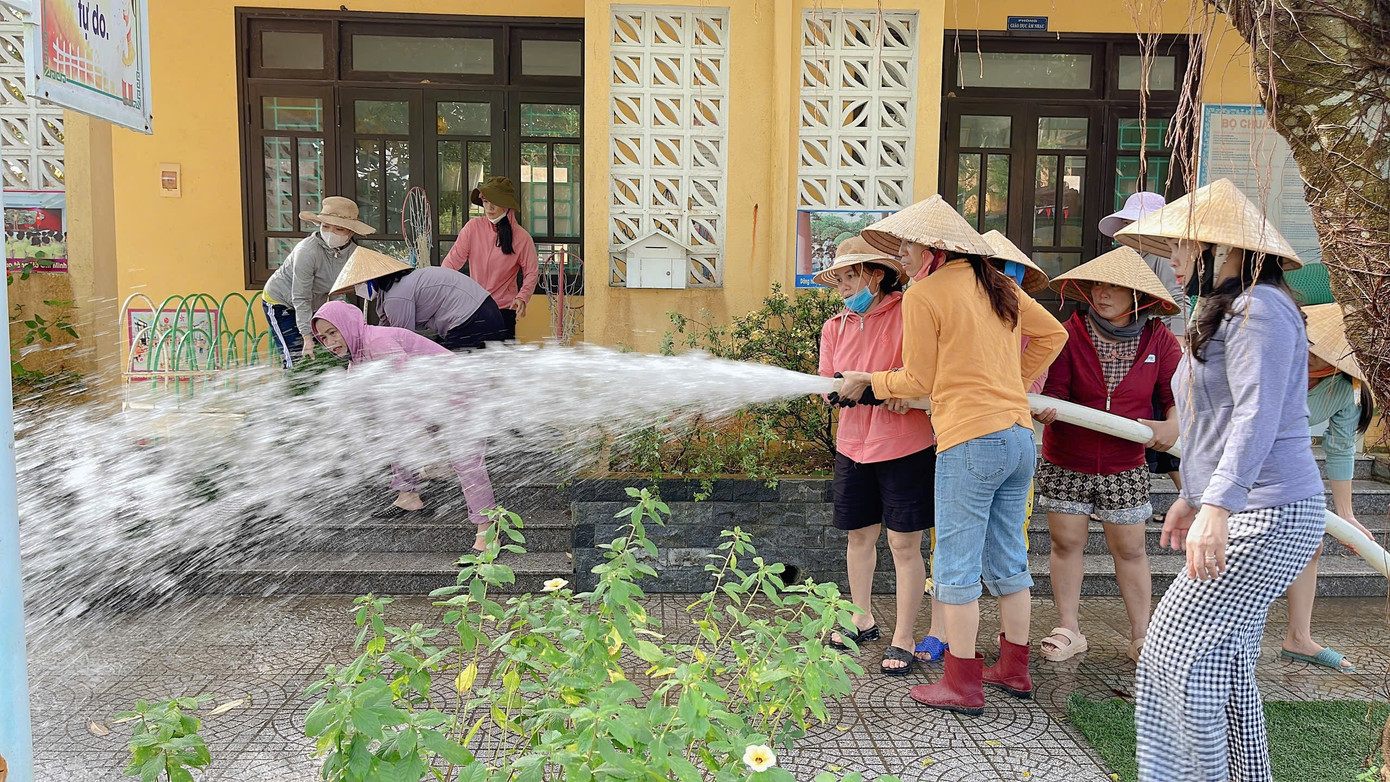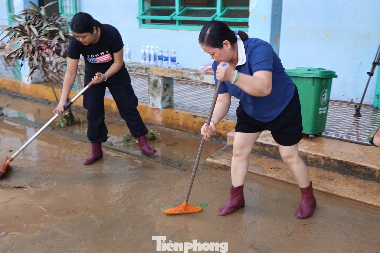 Cô Nguyễn Thị Sương, Hiệu trưởng nhà trường cho hay từ 3g sáng 31/10, các giáo viên đã đến trường dọn dẹp, tranh thủ khi bùn còn chưa đóng lớp để đẩy hết ra ngoài. Đến sáng, các dãy phòng cơ bản đã được dọn sạch, mọi người tiếp tục đuổi bùn non trên sân.