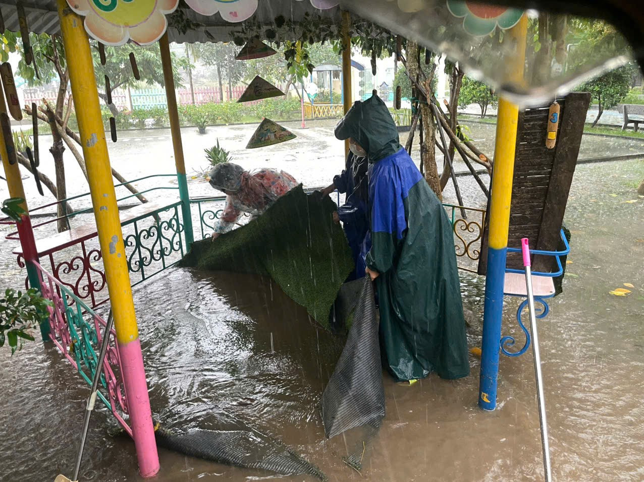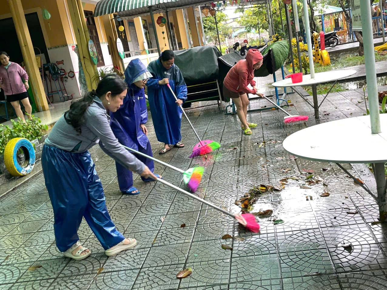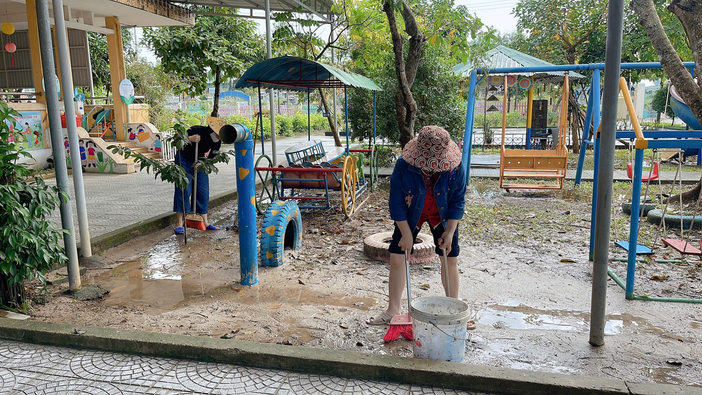 Vì đặc thù trường mầm non, các cô dọn dẹp rất kỹ càng từ phòng ốc đến bàn ghế, đồ dùng học tập, đồ chơi, sân trường, khu bếp... để đảm bảo môi trường khô ráo, giữ gìn vệ sinh, không ảnh hưởng đến sức khỏe của trẻ.