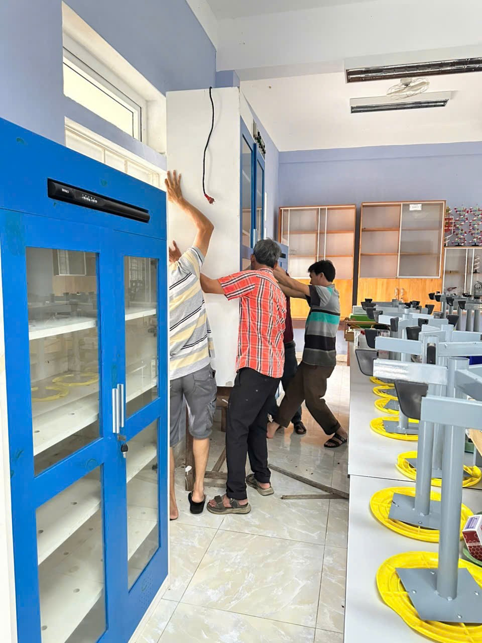 Các thầy giáo Trường THCS Ngô Thế Lân - xã Quảng Điền đang sửa chữa lại các trang thiết bị sau lũ rút- Ảnh Minh Hà