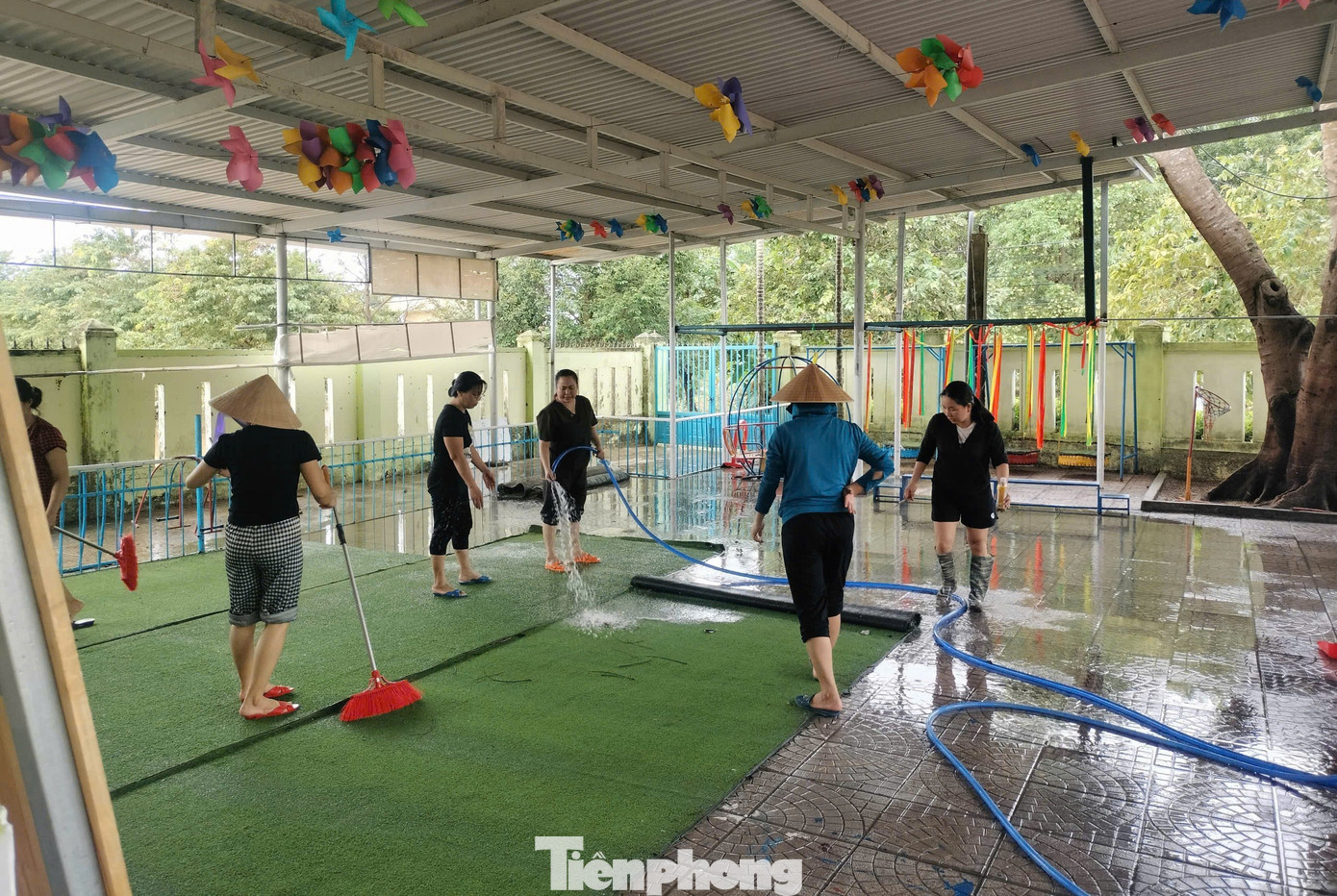Cả trường căng mình dọn dẹp từ khi nước rút để trường sớm khô ráo, sạch sẽ. Cô Trần Thị Thế, Hiệu trưởng nhà trường cho hay khi nghe tin dự báo mưa ngập, trường đã chủ động kê gác bàn ghế, dụng cụ học tập, thiết bị lên cao. Vì vậy nên bớt bị thiệt hại.