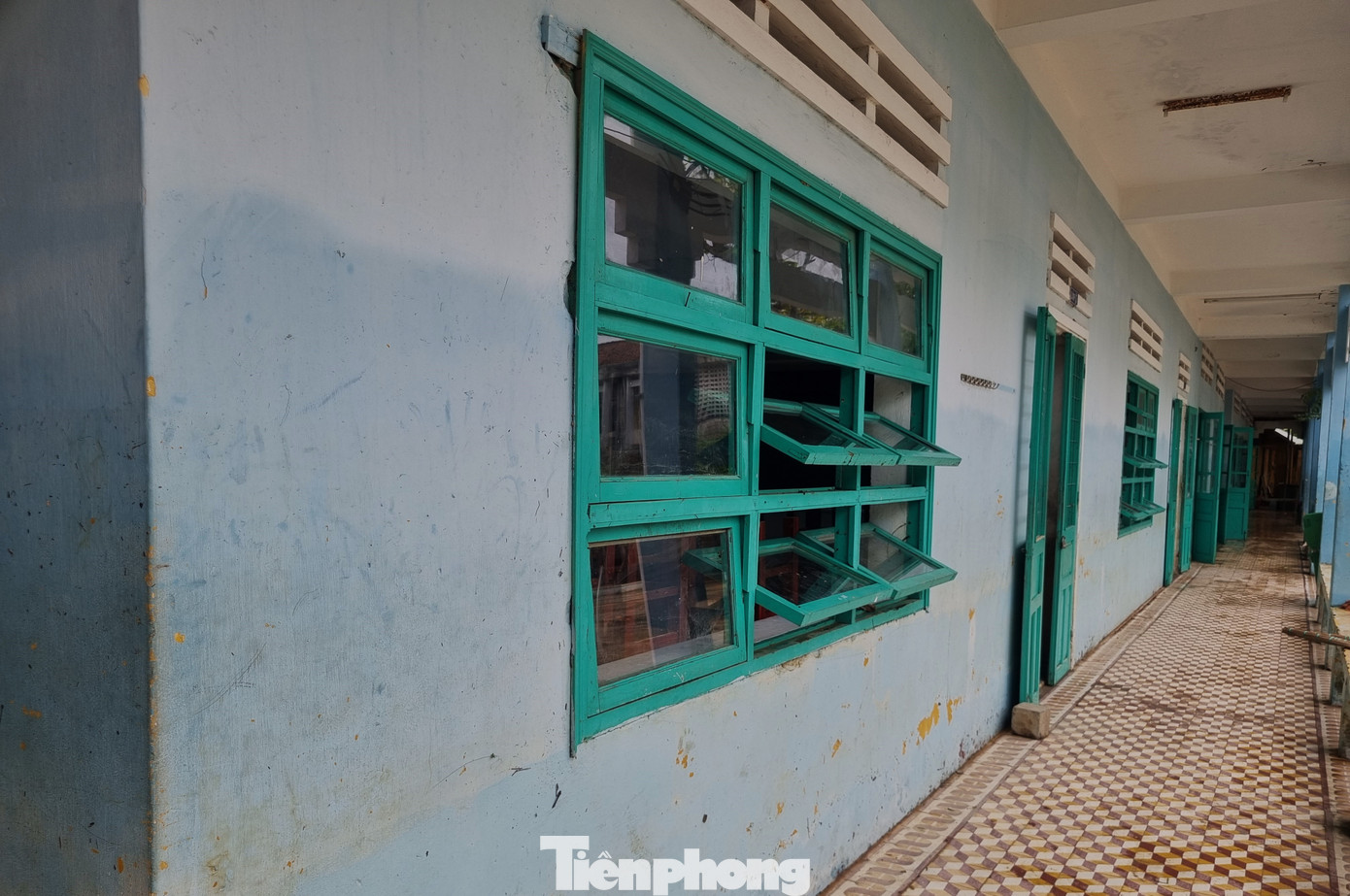 Trường THCS Nguyễn Hồng Ánh (phường Hòa Xuân, TP Đà Nẵng) ngập khoảng 1,5m. Dãy phòng học ở khu thấp bị nước lũ nhấn chìm bàn ghế. Dấu nước còn in đậm trên tường. Ảnh: Thanh Hiền.