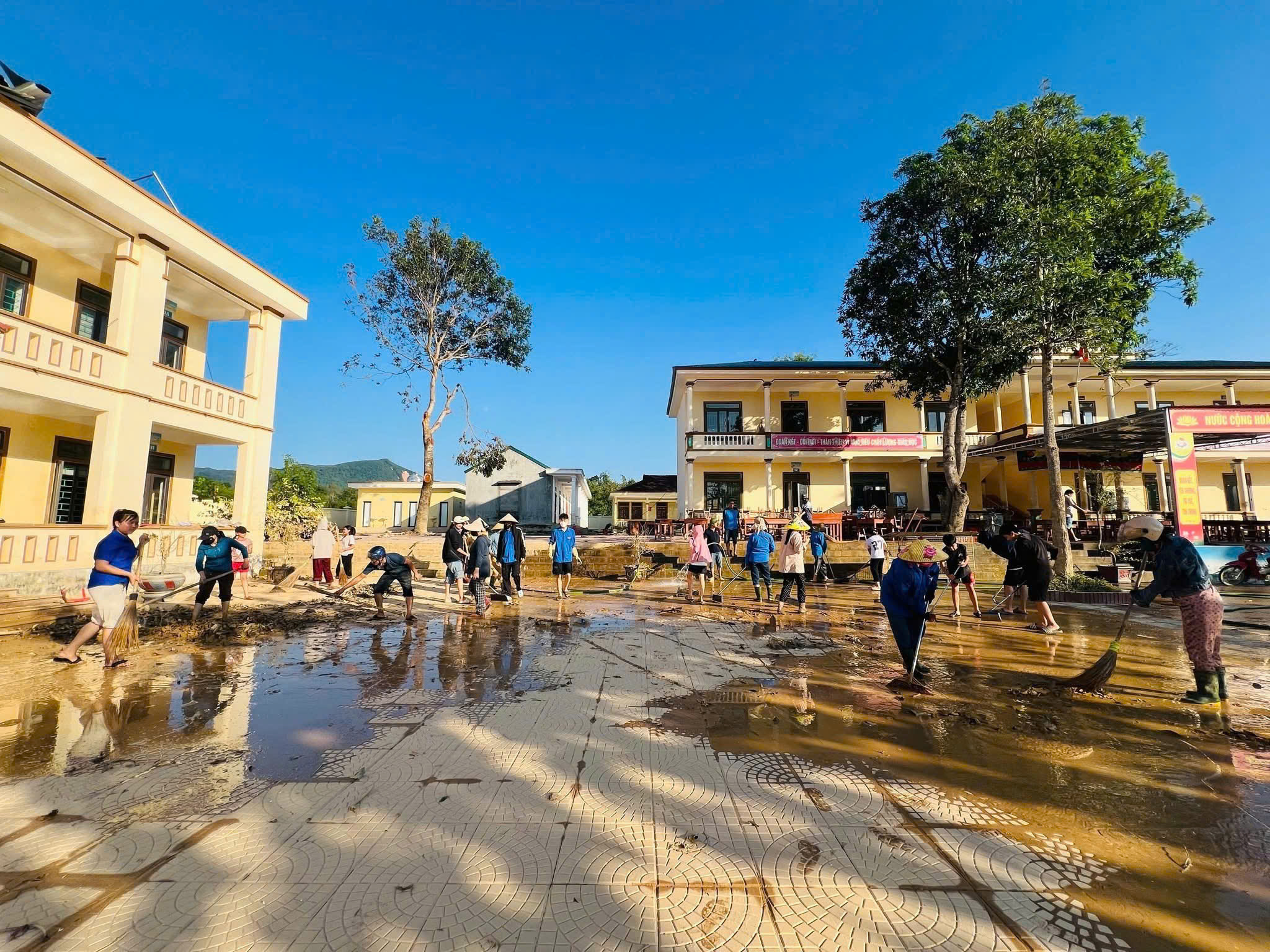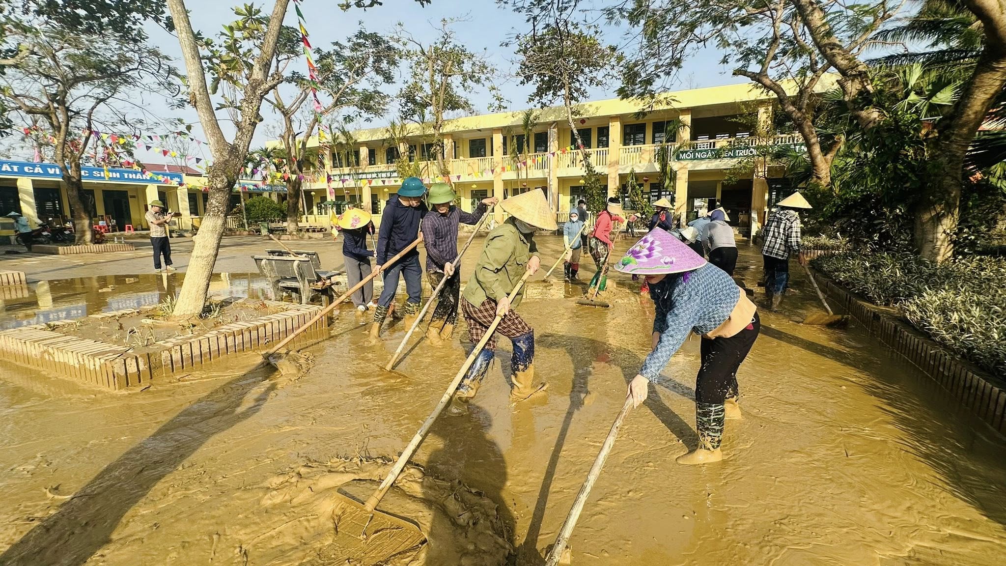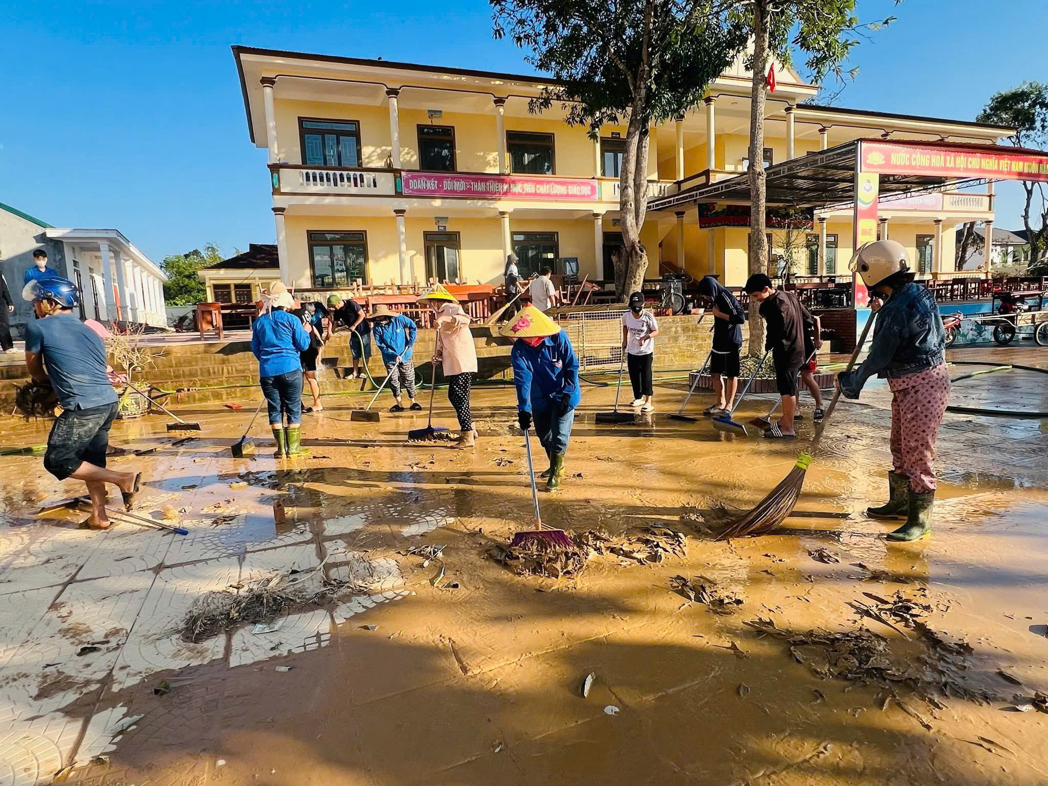 Trong số 26 trường chưa thể tổ chức học tập trở lại, có 10 trường vẫn đang ngập, hoặc các tuyến đường đi đến trường chưa thể lưu thông. Các trường còn lại lớp học bị tốc mái, nứt phòng học, mất điện và nhiều thiệt hại khác chưa khắc phục xong. Theo lãnh đạo UBND xã Lam Thành, bão số 10 quần thảo qua khiến nhiều trường học trên địa bàn của xã bị tốc mái, hư hỏng hoặc bị chìm trong nước lũ. Đến sáng 6/10, còn 4 trường học đang được dọn dẹp, khắc phục, phấn đấu ngày mai, 100% học sinh sẽ trở lại trường. Trong ảnh là các thầy cô Trường Tiểu học Phạm Hồng Thái dọn dẹp sau lũ.