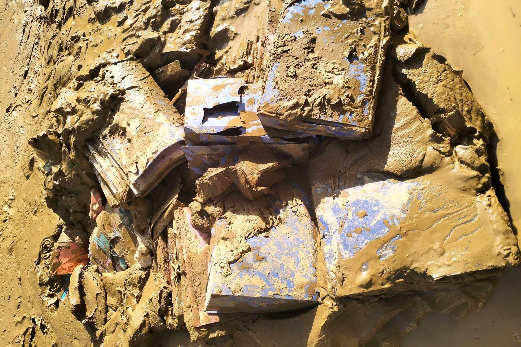 Sách vở của các em vùng lũ bị ngập trong bùn non.