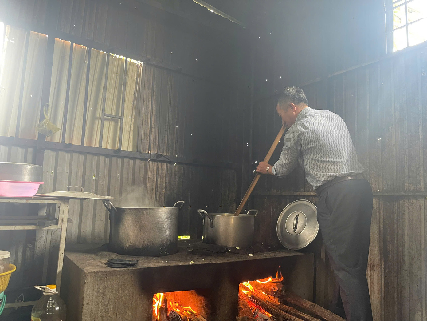 Giờ nghỉ trưa ở Trường PTDTBT Tiểu học – THCS Đăk Sao 1, khung cảnh thật bình dị, khói bếp lan giữa sân trường, thầy cô đảo cơm, các em xếp hàng ngay ngắn chờ đến lượt. Những bữa cơm giản dị nhưng đầy yêu thương giúp các em no bụng, đủ sức học buổi chiều.