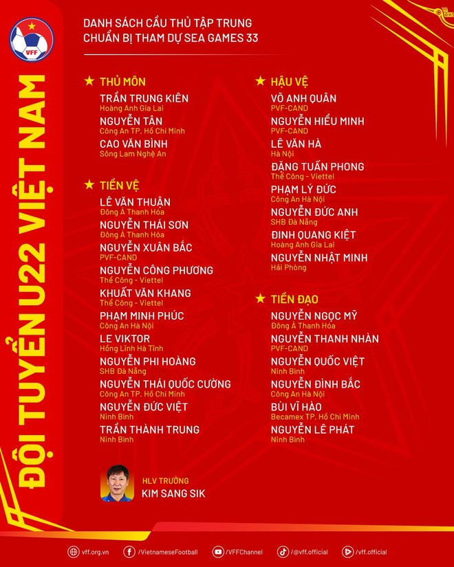 Trước đó, hôm 21/11, Huấn luyện viên trưởng Kim Sang-sik cũng đã công bố danh sách 28 cầu thủ U22 Việt Nam cho đợt tập trung cuối cùng chuẩn bị SEA Games 33 tổ chức tại Thái Lan.
