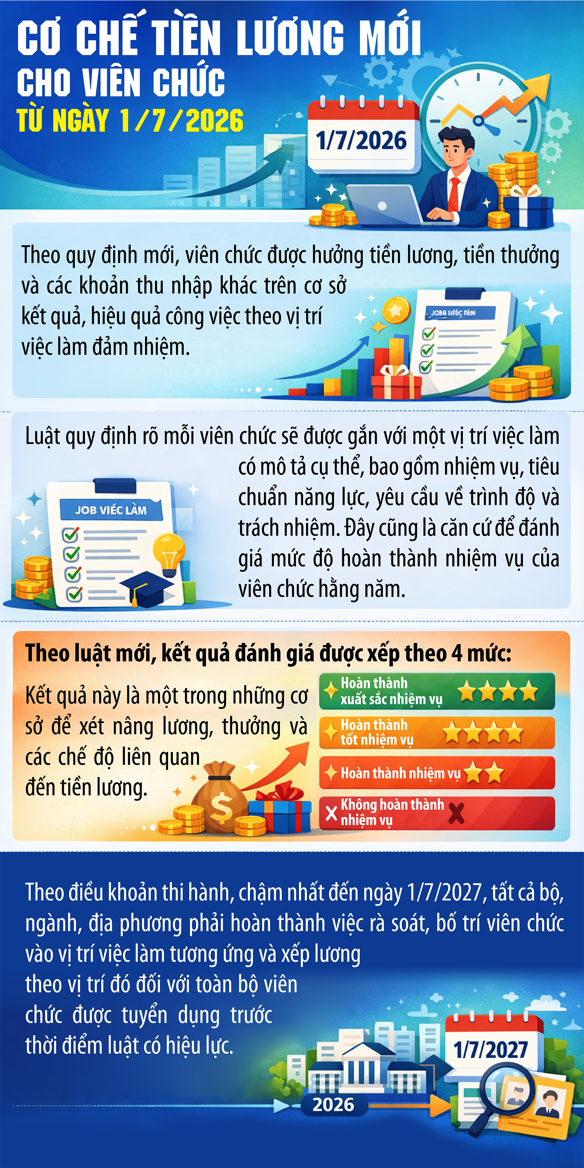 Một trong những thay đổi lớn nhất là việc chuyển từ cơ chế lương chủ yếu dựa vào ngạch - bậc và thâm niên sang cơ chế lương gắn với vị trí việc làm, kết quả và hiệu quả công việc.
