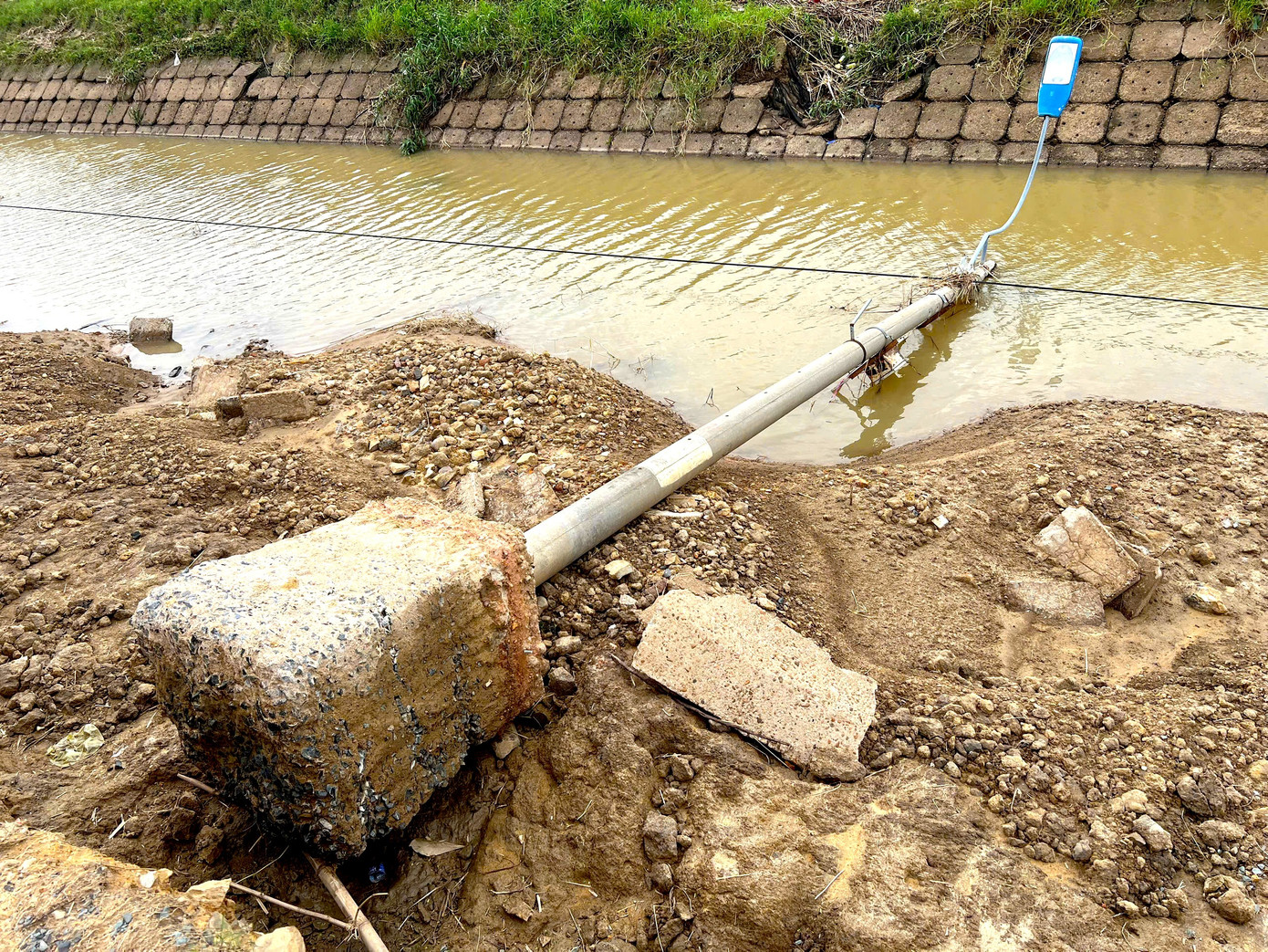 Hàng loạt cột điện dọc theo quốc lộ 29 bị xói mòn, đổ rạp về một phía từ Bắc vào Nam.
