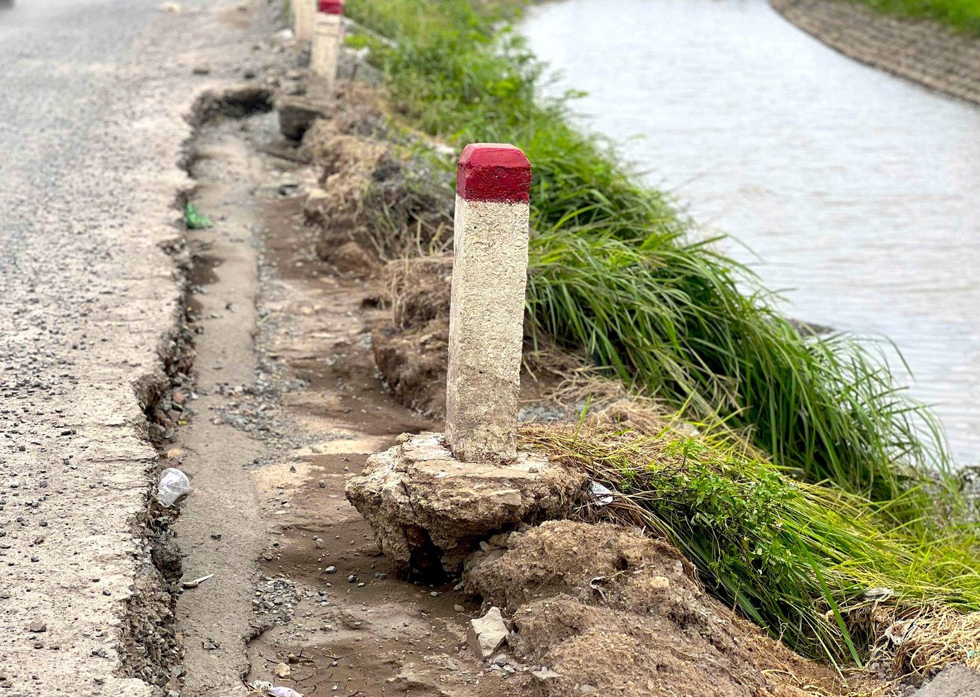 Các cột mốc dọc quốc lộ 29 bị xói mòn gốc.