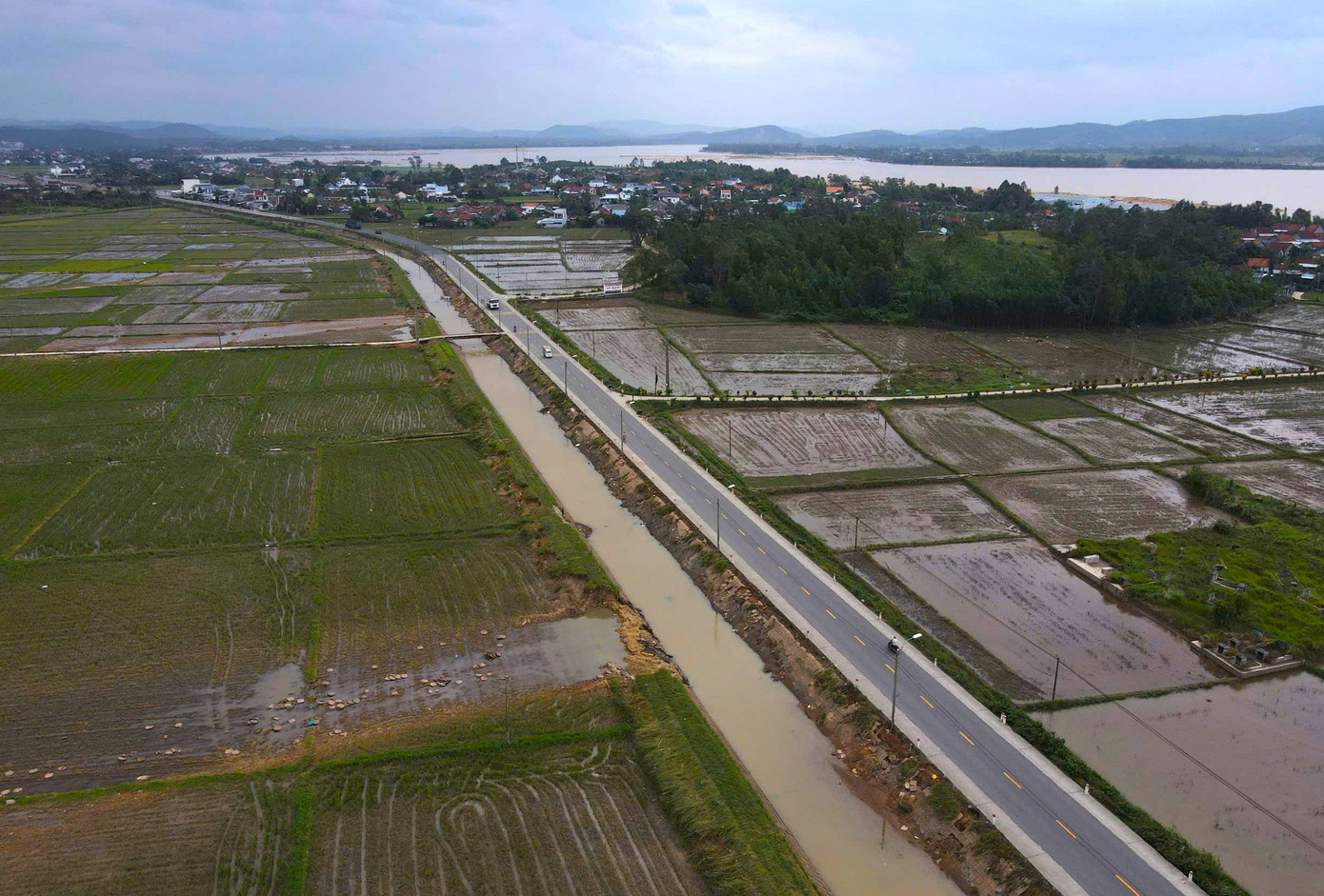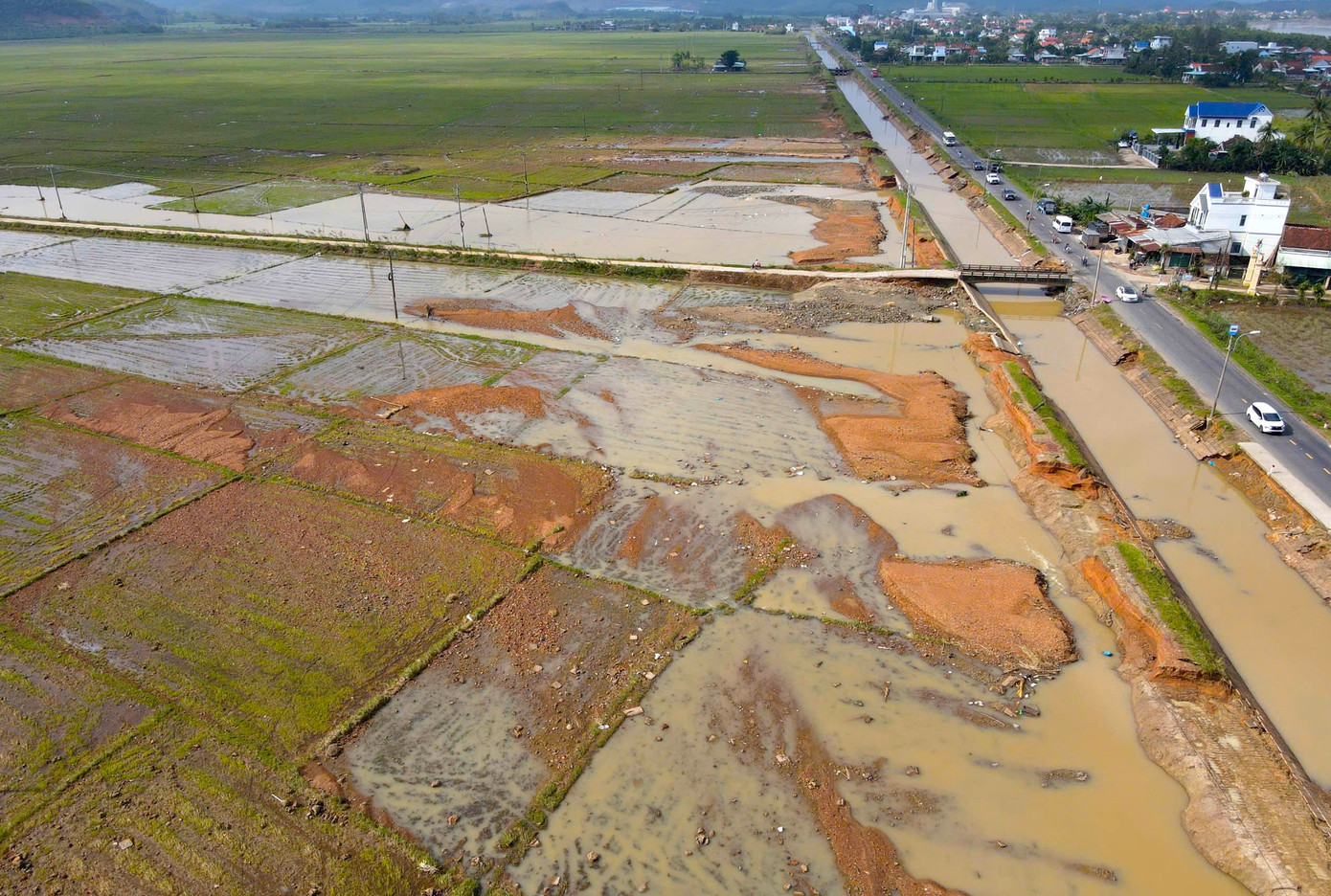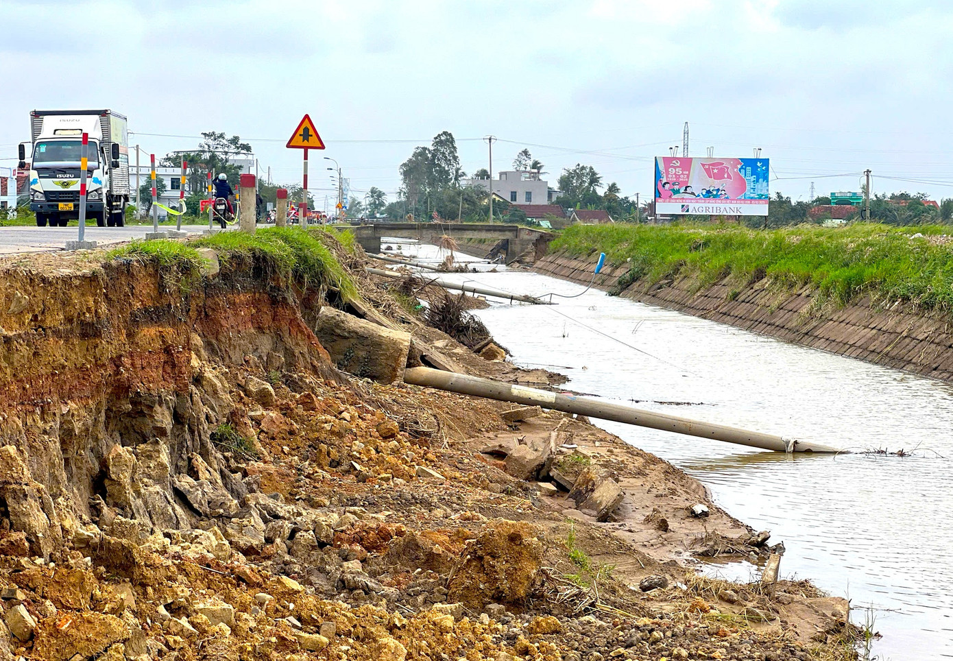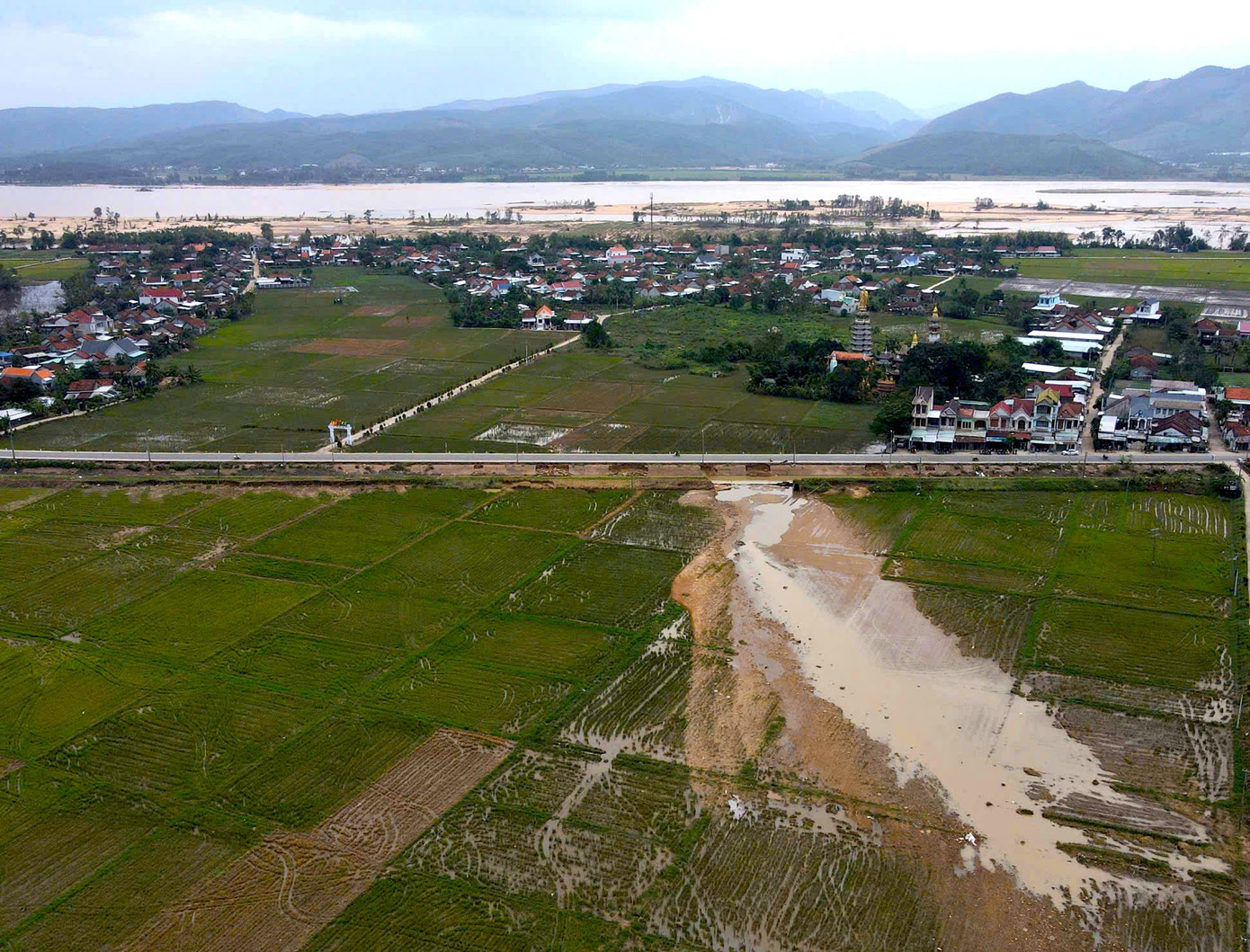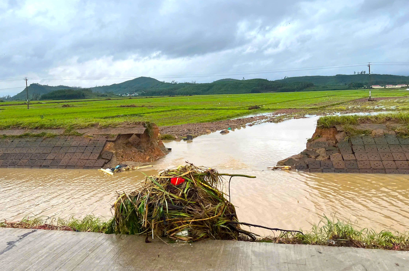Trải dài khoảng 10 km dọc theo quốc lộ 29 là các điểm bờ mương bị vỡ do nước lũ từ sông Ba tràn qua.
